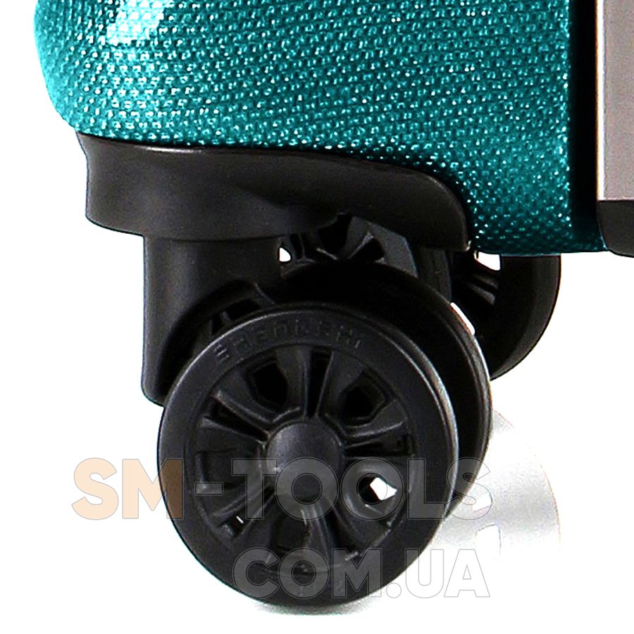 Чемодан оснащен четырьмя полноповоротными, спаренными колесами с возможностью независимого разворота каждого колеса на 360°. Системой предусмотрено равномерное перераспределения нагрузки на каждое колесо, что в свою очередь способствует плавному качению и маневренности чемодана, прилагая при этом минимум усилий.