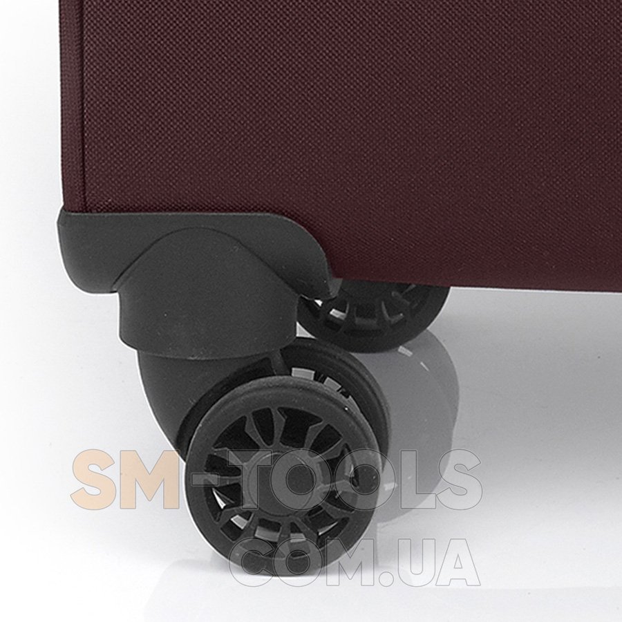 Чемодан оснащен четырьмя полноповоротными, спаренными колесами с возможностью независимого разворота каждого колеса на 360°. Системой предусмотрено равномерное перераспределения нагрузки на каждое колесо, что в свою очередь способствует плавному качению и маневренности чемодана, прилагая при этом минимум усилий. Колеса изготовлены из высокотемпературного термопластичного полиуретана (TPU). Материал обладает прочностью сравнимой с пластиком, гибкостью силикона, а так же имеет повышенную устойчивость к перепадам температур. Отличительной особенностью колес из TPU материала является снижение шума до минимума при качении чемодана по неровной поверхности. Благодаря устойчивости к истиранию материал колес отличается длительным сроком эксплуатации.