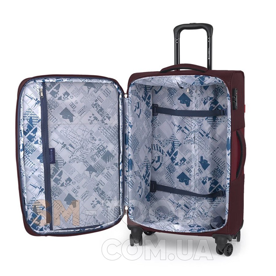 - Чемодан разделен перегородкой на молнии на два основных отделения, перегородка имеет сетчатый карман на молнии