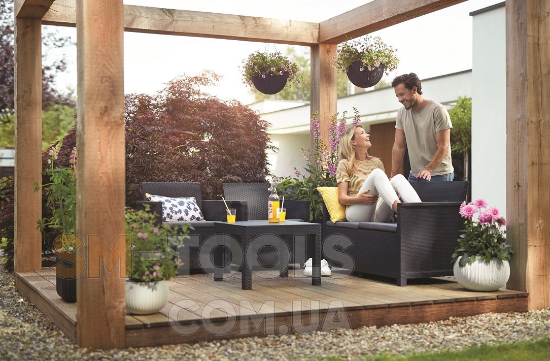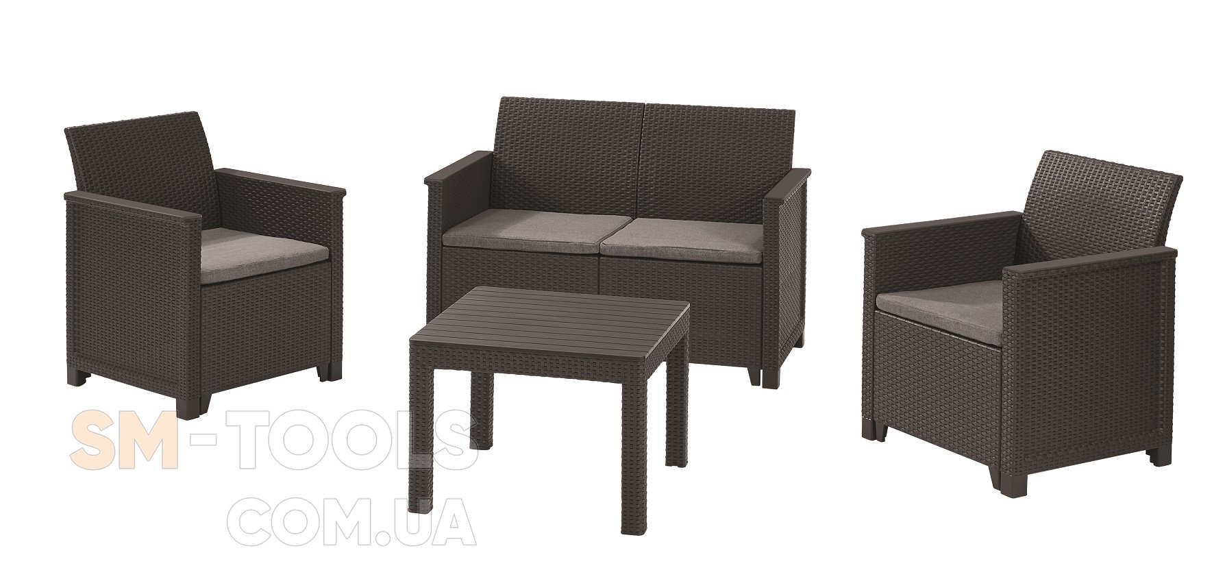 Новий лаунж-набір Emma ідеально підходить для створення затишного місця для відпочинку на свіжому повітрі З його допомогою Ви можете облаштувати сад вашої мрії або терасу, навіть якщо ви не маєте великого простору. У комплект входять 2 крісла, 2-місний диван і класичний столик. Текстура ротанга і гладкі підлокітники, а також резольна стільниця підкреслюють унікальний характер комплекту. Комплект можна легко чистити. Надзвичайно простий МОНТАЖ ПО СИСТЕМІ "JUST CLICK AND GO"
