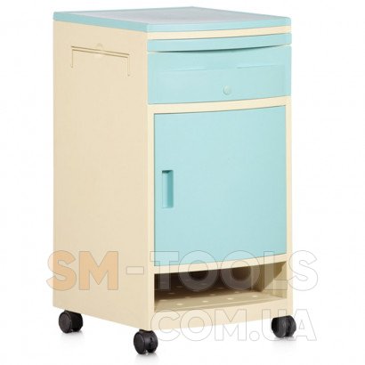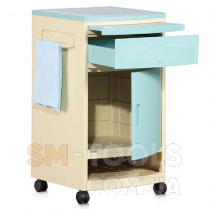 Прикроватная тумба из пластика с металлическим каркасом, оснащенная колесиками. Благодаря вместительным полкам и легко выдвигающимся ящикам внутри удобно хранить личные вещи.