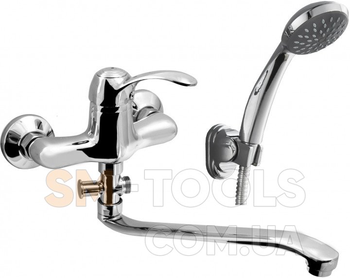 Змішувач комплектується душовою лійкою з настінним утримувачем і душовим шлангом в металевому оплетені.