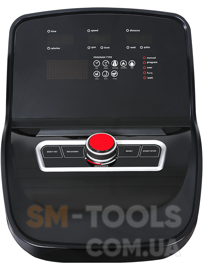 Функції комп'ютера: режим сканування, час, дистанція, витрачені калорії, швидкість, кількість обертів за хвилину, пульс, потужність, а також контроль серцевого ритму, фітнес оцінка, індекс маси тіла та рівень тілесного жиру