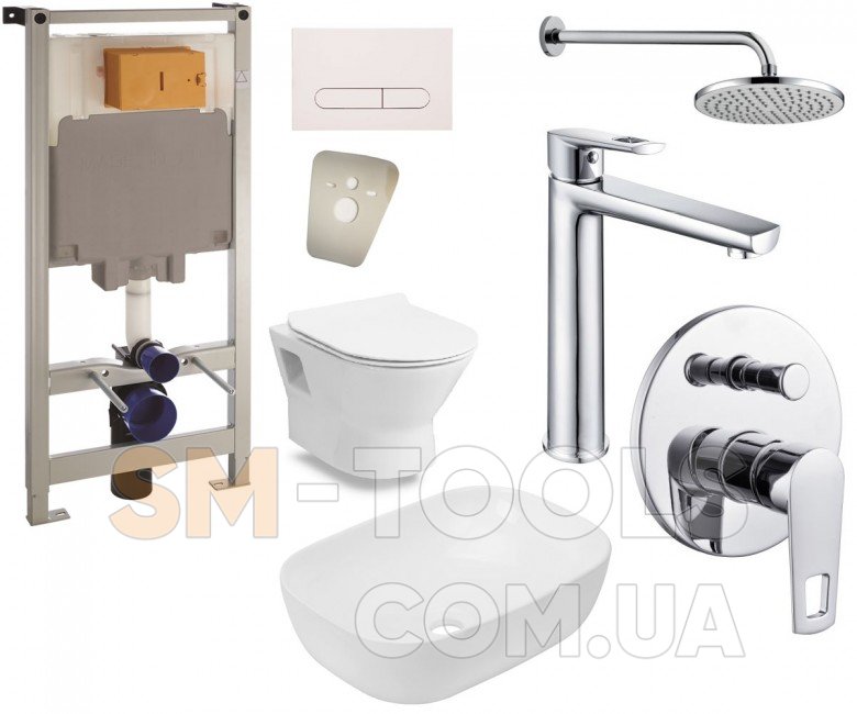 - Комплектация: набор для душа, смеситель для умывальника, умывальник, унитаз, инсталляция, смеситель для душа, верхний душ