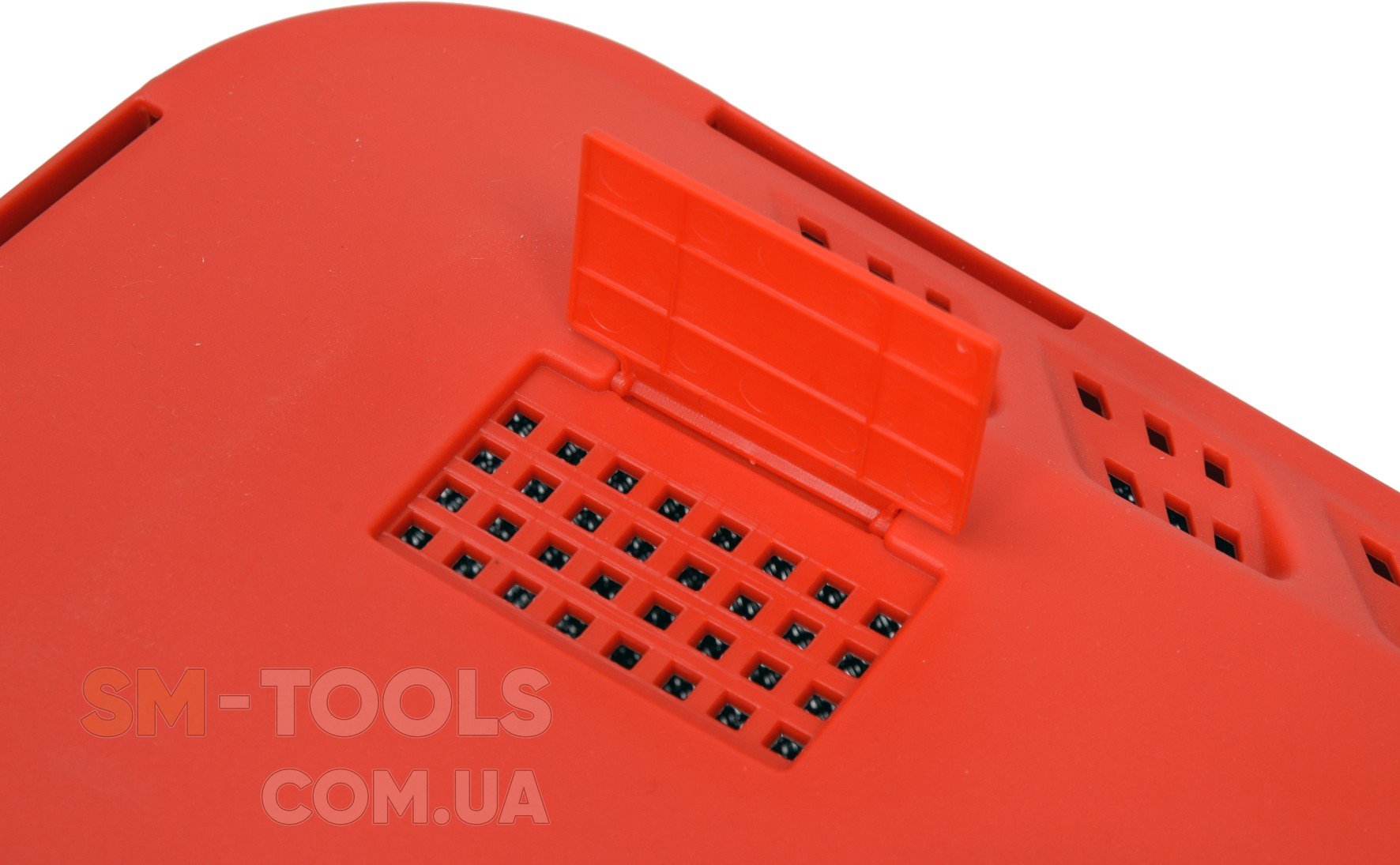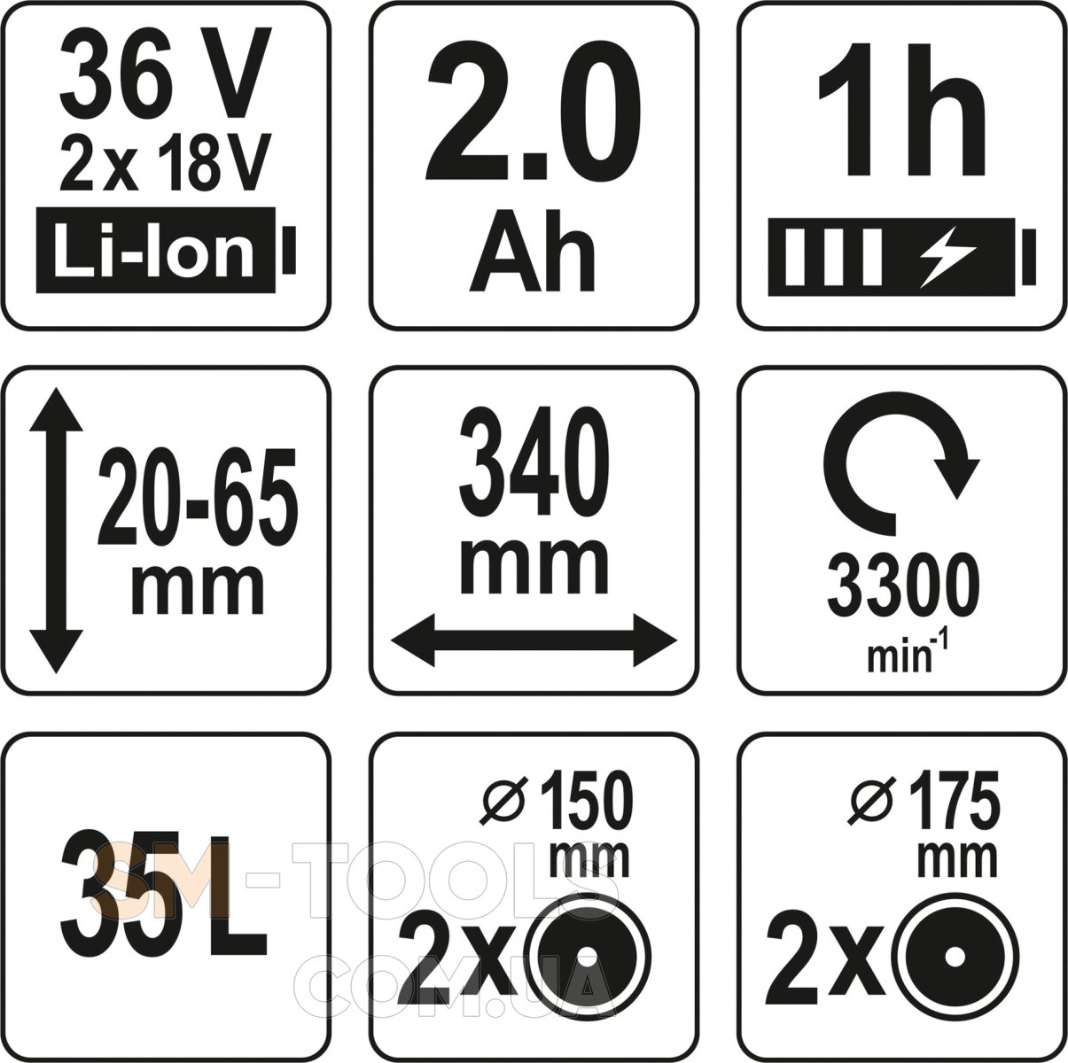 - Доступні запасні акумулятори: 2 Ач (YT-82842), 3 Ач (YT-82843) та 4 Ач (YT-82844); Акумулятор YT-82845 6 Ач несумісний з косаркою