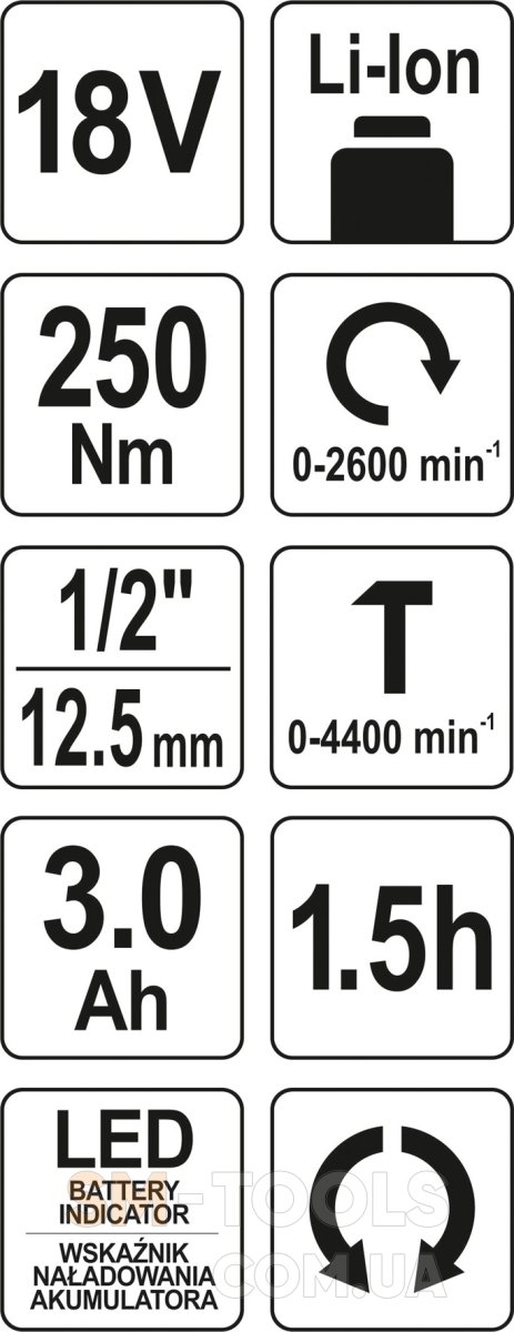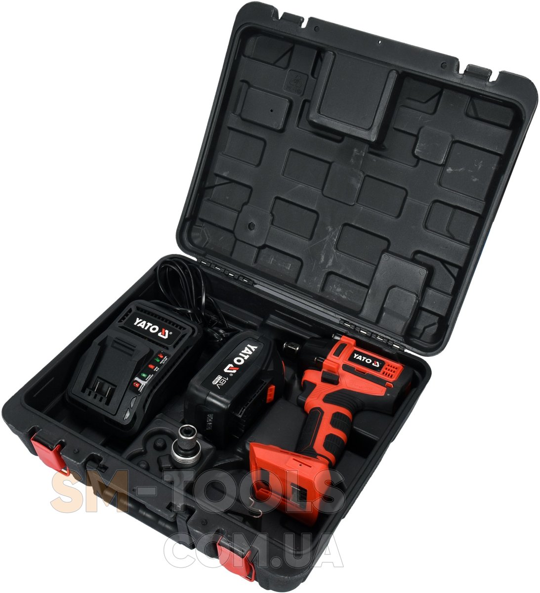 - Доступні запасні акумулятори: 2 Ач (YT-82842), 3 Ач (YT-82843) та 4 Ач (YT-82844)