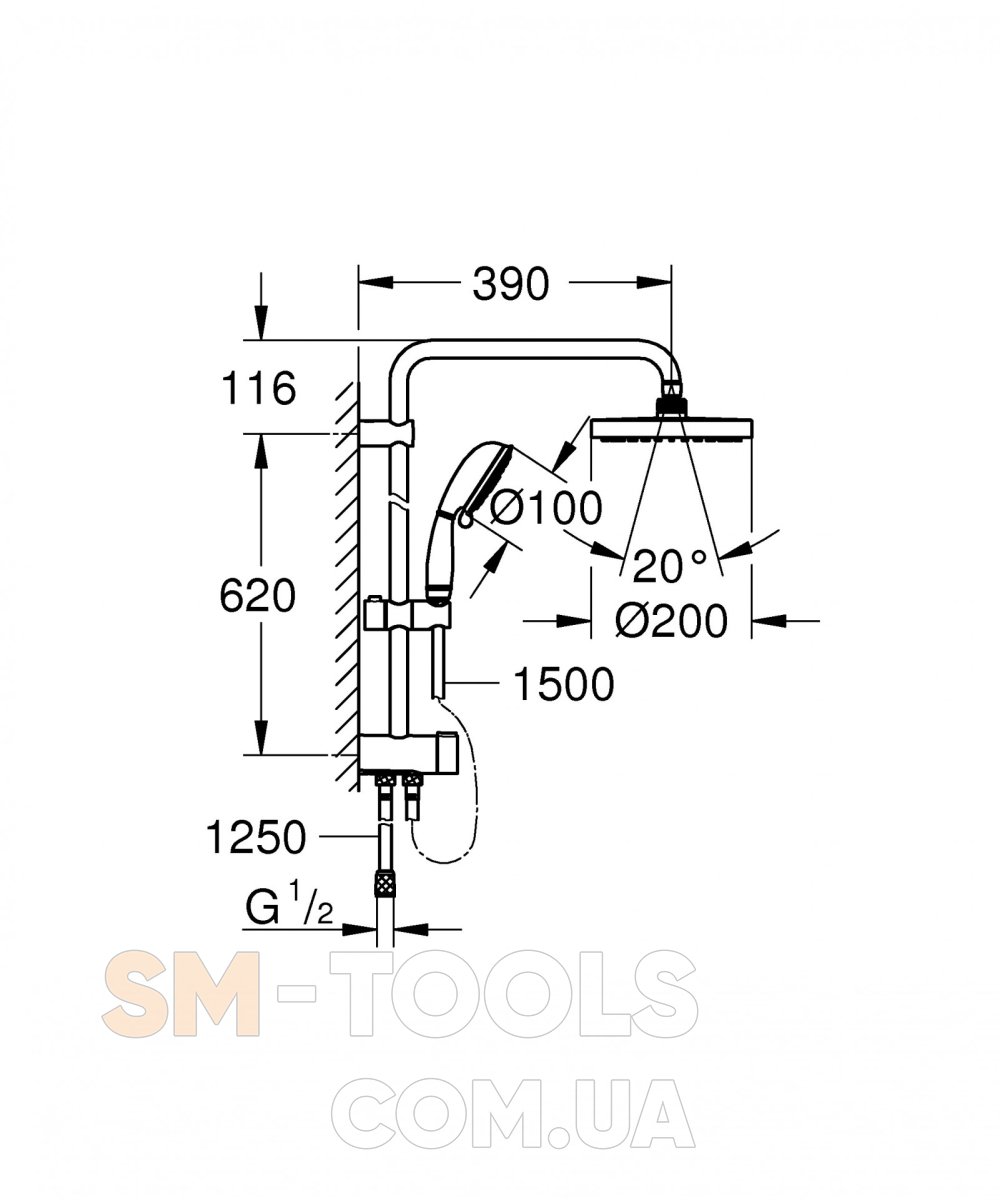 Оснащення: душовий кронштейн, перемикач, верхній душ, душовий шланг, ручний душ