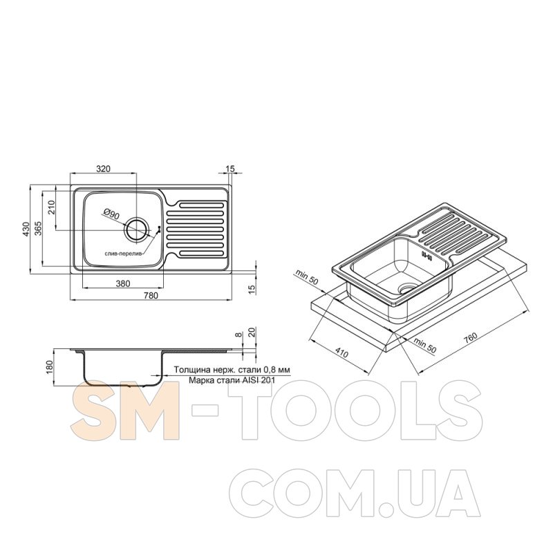 Опис Кухонна мийка Qtap 7843 Satin 0,8 мм (QT7843SAT08):