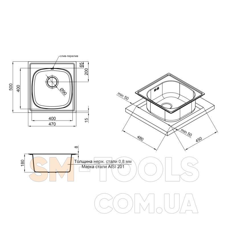 Опис Кухонна мийка Qtap 5047 Satin 0,8 мм (QT5047SAT08):