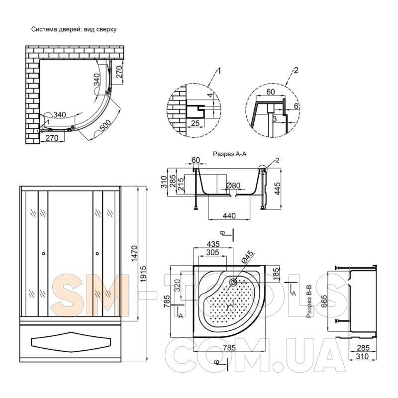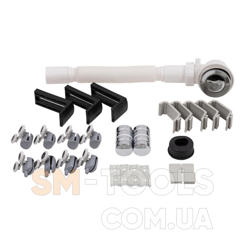 Піддон, сифон, профіль, подвійні ролики, кріплення, глухе скло, скляні двері, ручки, з‘єднуючий елемент