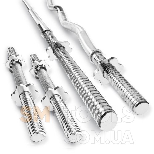 Прямий, ламаний і 2 гантельні грифи. Грифи виготовлено з хромованої сталі, тому вони надзвичайно міцні та надійні. Зверніть увагу на рифлені ділянки для хвату – глибокі поперечні засічки забезпечують зручне зчеплення з руками під час виконання вправ. Ви можете бути впевнені у своєму комфорті та безпеці, штанга не вислизне з рук навіть під час інтенсивних тренувань.