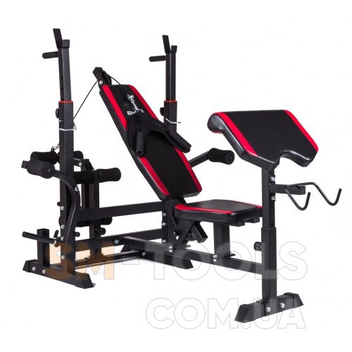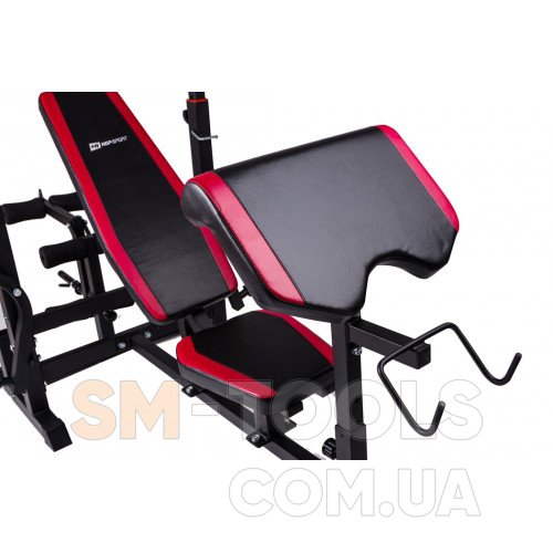 Лавка тренувальна Hop-Sport HS-1075. Лавка дозволяє ефективно тренувати м’язи пресу, передпліччя, плечового поясу і ніг. Широкий асортимент варіантів використання доповнюється тягами для ніг та рук збоку і з-за голови. До того ж лавка обладнана ручками для французьких відтискань і партою Скотта зі змінною висотою для пропрацьовки трицепсів. 5-ступеневе регулювання кута нахилу спинки та 7 рівнів висоти стійок для штанги дозволяють виконувати широке різноманіття вправ на зміцнення багатьох груп м’язів. Лавка виготовлена з високоякісних матеріалів відповідно до європейських стандартів якості. Спинка і сидіння обтягнуті м’якою оббивкою і 100% екологічною шкірою. Широкі сталеві профілі гарантують безпеку під час фізичних вправ, а порошкове покриття забезпечує довговічність конструкції протягом багатьох років.