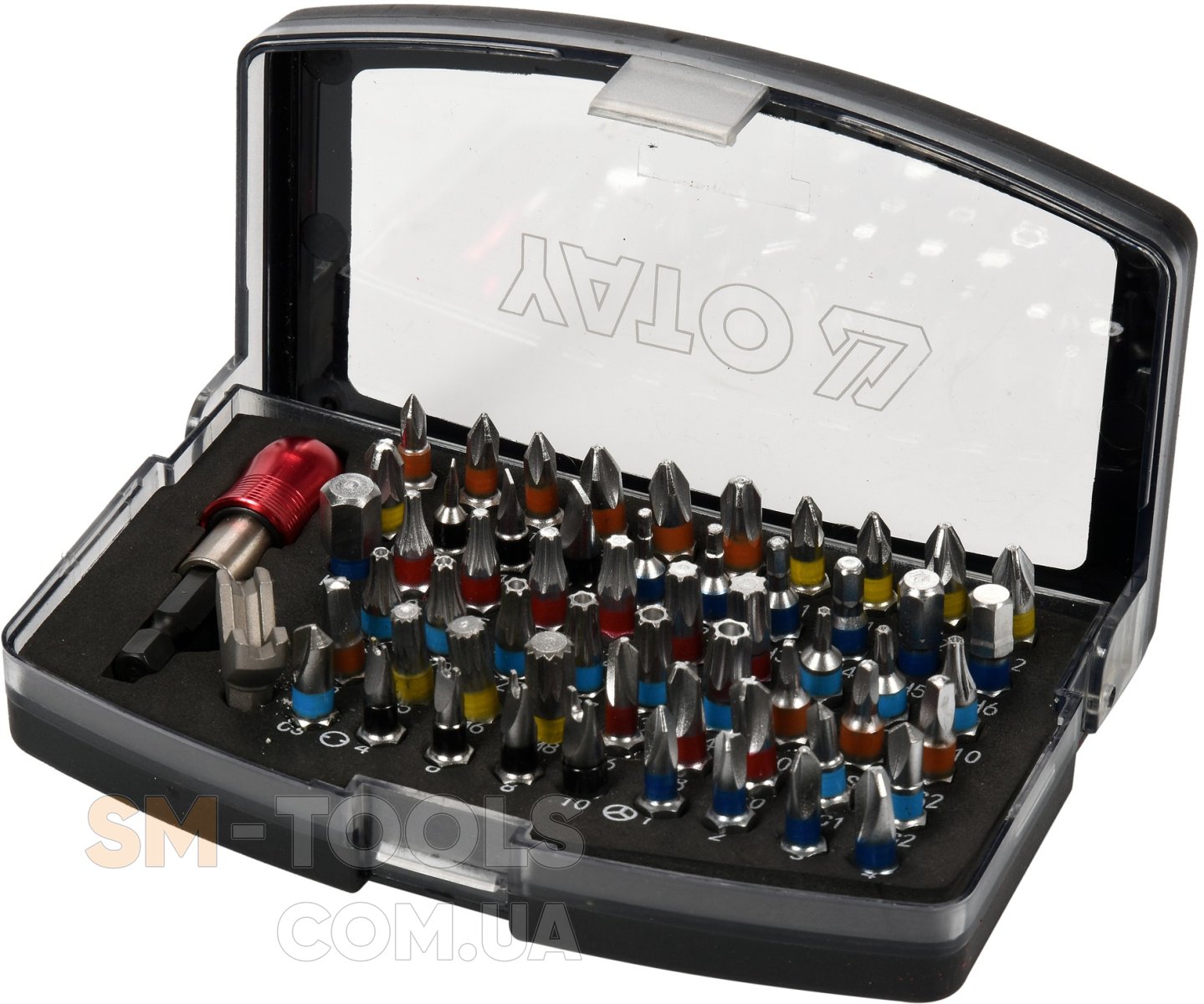 Професійний набір викруткових насадок YATO YT-06424 складається з 59 елементів. Призначений для закручування і відкручування гвинтів у важкодоступних місцях. Рекомендується для автосервісів та автолюбителів. Вони містять функціональні наконечники з кислотостійкої сталі AISI S2 і перехідник. Упаковані в коробку з розбірливим маркуванням елементів.