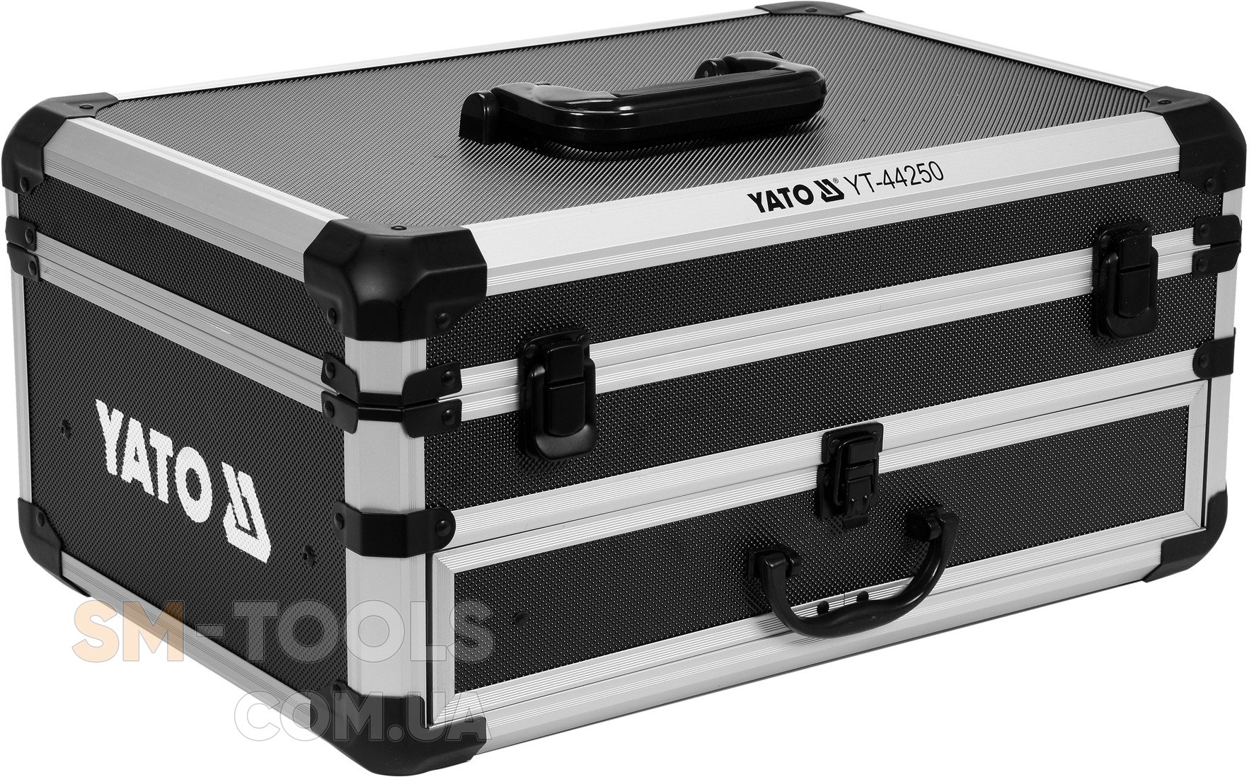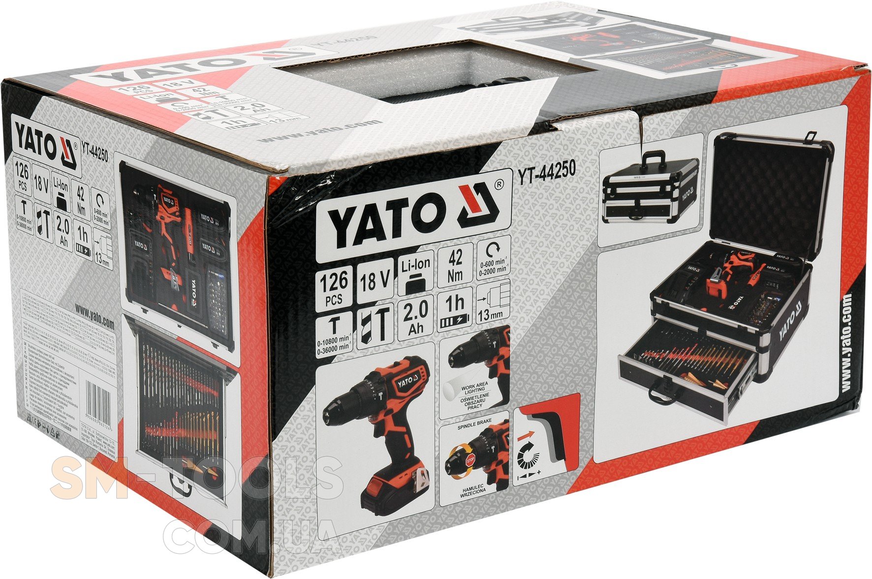 Дриль-шуруповерт з набором свердл і викруткових насадок YATO YT-44250. В наборі 126 різних елементів. Всі вони упаковані в зручний алюмінієвий кейс розміром 450 x 330 x 210 мм.
