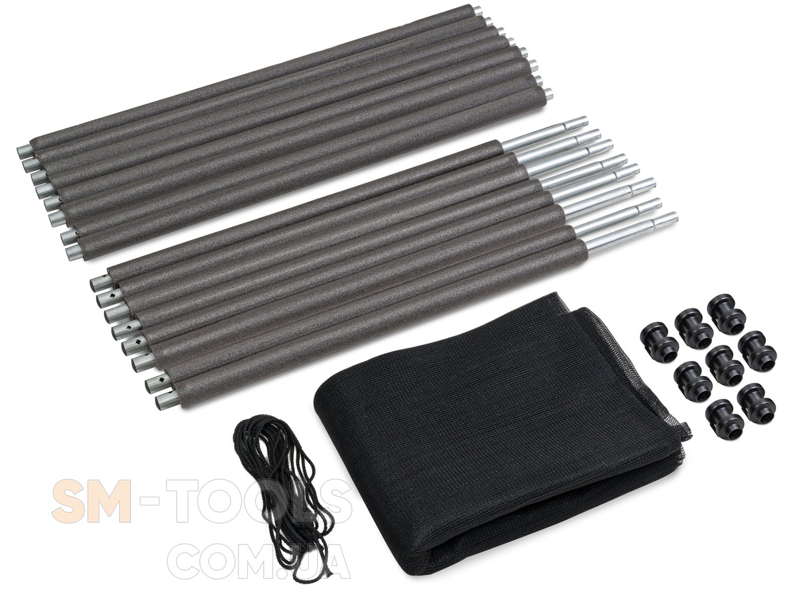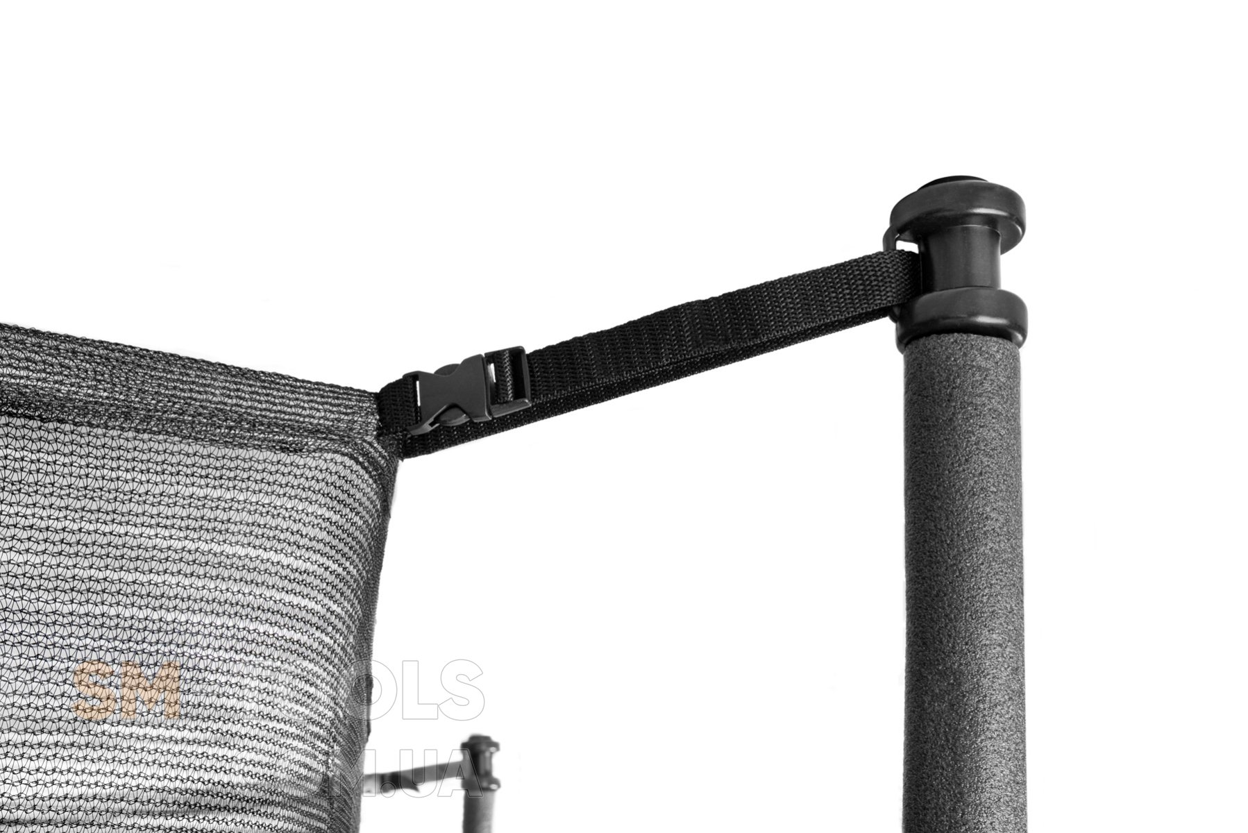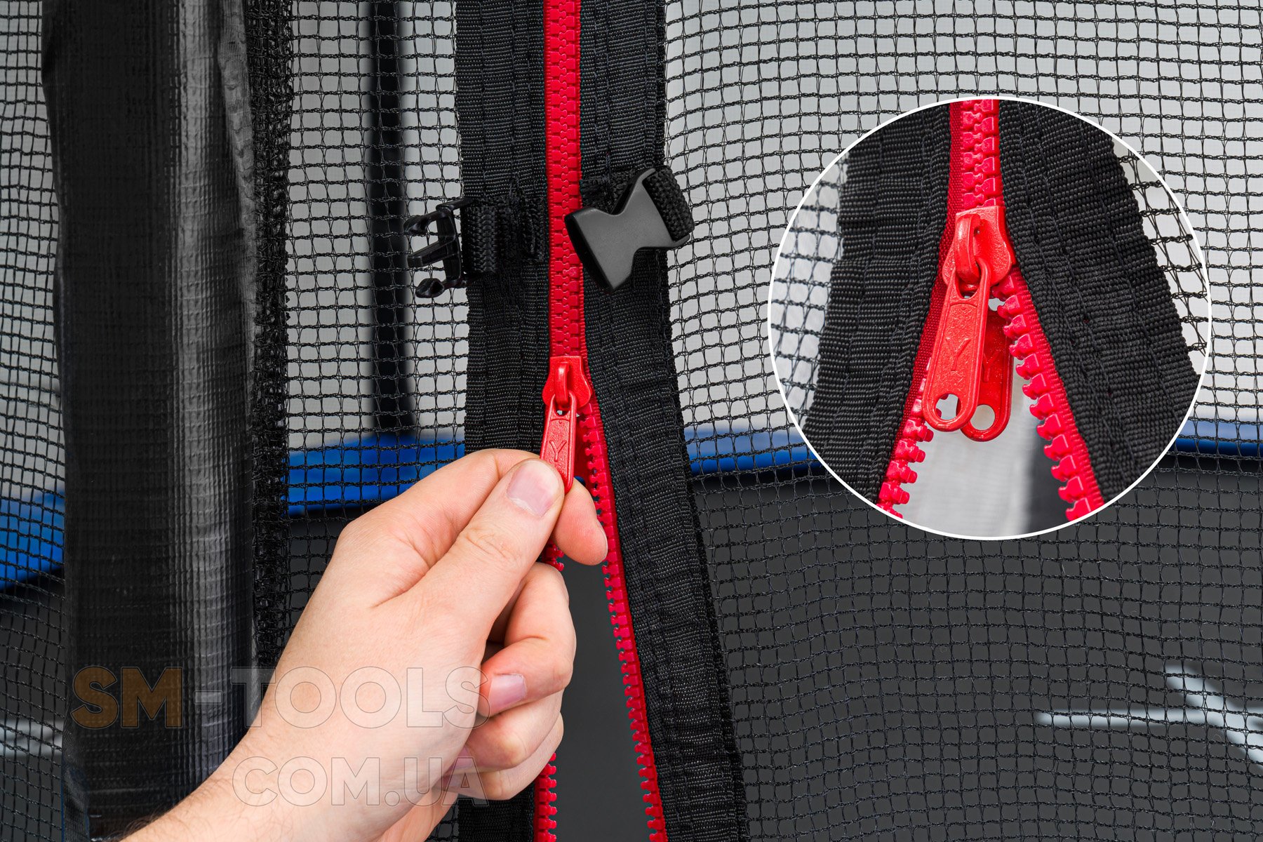 Поліетиленова сітка висотою 180 см з міцним переплетенням, застібається на блискавку і фастекси, і гарантує безпеку навіть під час активних ігор. Це особливо актуально для маленьких непосидючих користувачів. Застібка-блискавка має L-подібну форму, що робить вхід в батут і вихід з нього ще більш зручним. Крім того, блискавка має інший колір, ніж сітка, що дозволяє дітям легко знайти вихід.