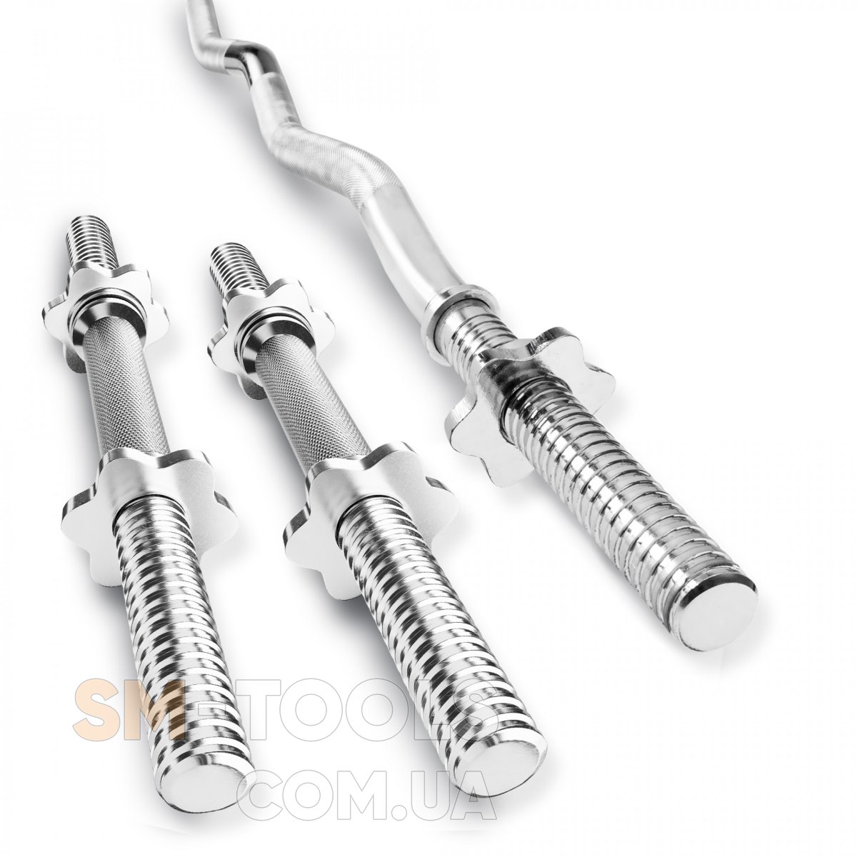 Грифи в цьому наборі відлиті з високоякісної хромованої сталі. Рифлені ділянки для хватів підвищують комфорт при виконанні тренувань. Ви можете бути впевнені у своїй безпеці, штанга не вислизне з рук навіть під час інтенсивних тренувань.