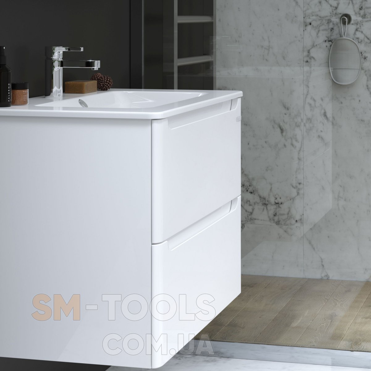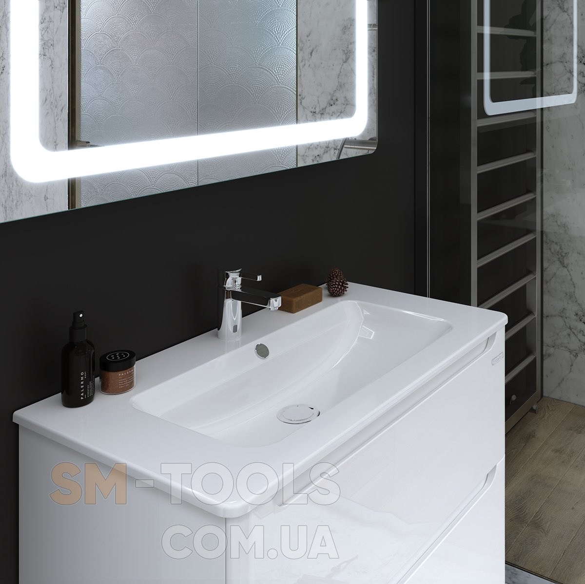 У даній колекції кілька ключових відмінностей: першокласний імпортний керамічний умивальник (Іспанія), внутрішнє наповнення ящиків в кольорі темно-сірий графіт, товсті фасади з 19мм МДФ, боковини МДФ. Ще одна унікальна відмінність - знімна панель в тумбі за фасадом, якій можна самостійно надати будь-яке забарвлення в стилі вашої ванної кімнати (камінь, бетон, дерево, однотонні кольори і т.д.).