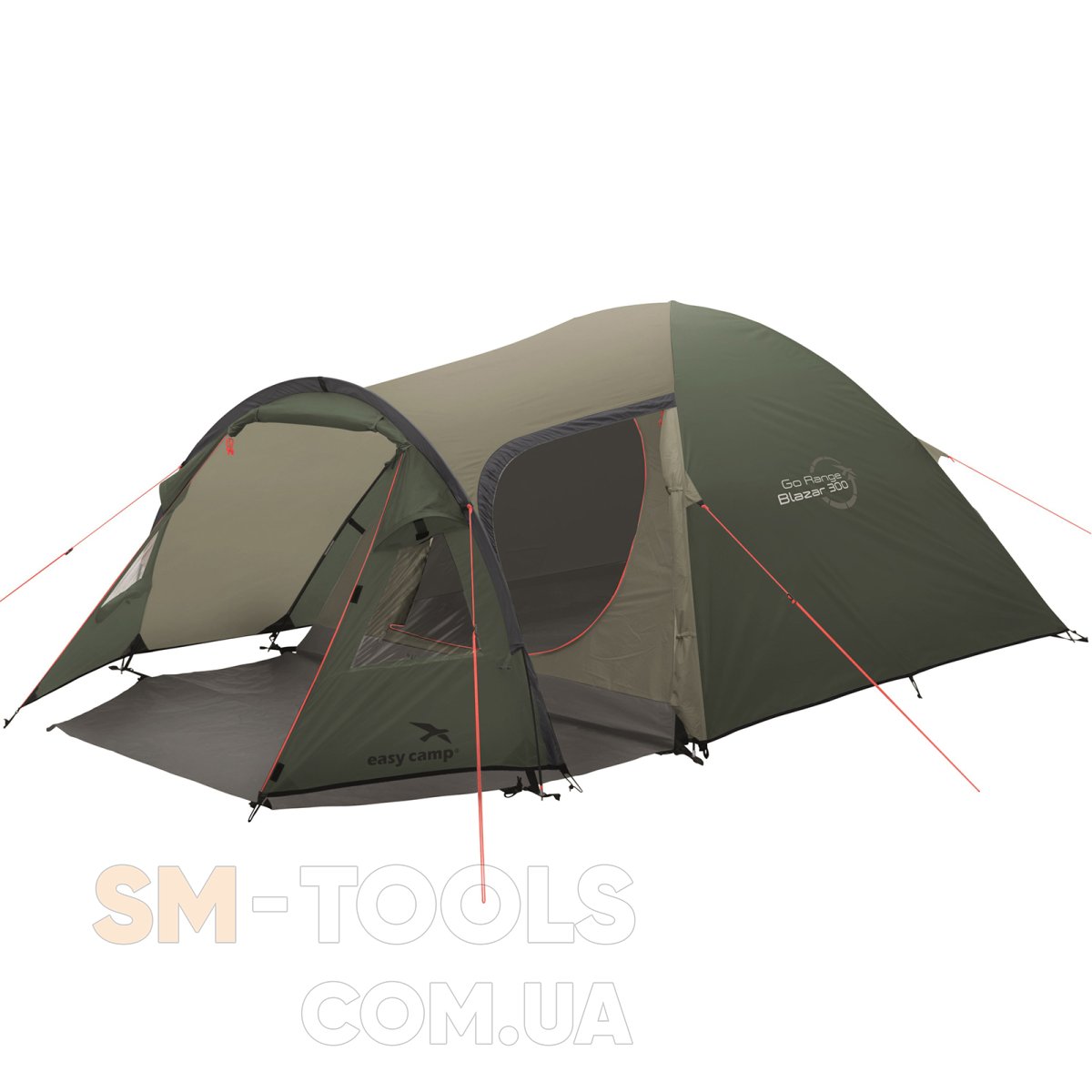Easy Camp Blazar 300 - тримісний купольний намет, який ідеально підходить для пар, молодих сімей та відпочинку з друзями. У даній моделі досить просторий тамбур зі знімною підлогою та дві вхідні двері для зручного доступу. Прозорі вікна наповнюють внутрішній простір світлом, а штори сприяють усамітненню у разі потреби. Фронтальні вентиляційні вікна, що регулюються, у поєднанні з великою вентиляційною панеллю в тильній частині намету забезпечують необхідну циркуляцію повітря. Внутрішній намет має D-подібні двері з москітної сітки для захисту від комах та точку підвісу для ліхтаря.