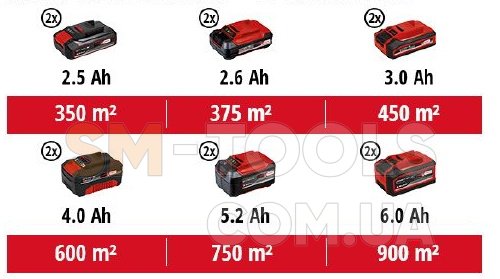 - Площа скошування на одному заряді до 900 м² (в залежності від акумулятора)
