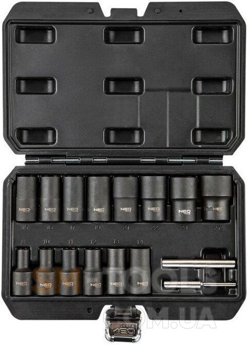 Торцеві головки 1/2" для пошкоджених гайок, набір 16 шт. NEO 11-920 – це продукт для професійного користувача, що цінує якість продукту. В набір входять 14 торцевих головок різних розмірів і 2 екстрактора для видалення гвинтів з гайок. Головки можуть працювати з ударними ключами. Завдяки внутрішній спіралі інструмент автоматично затискається на пошкодженому гвинті або гайки, дозволяючи тим самим безпечно з відкрутити. Все упаковано в зручний міцний кейс, який полегшує зберігати порядок в майстерні.