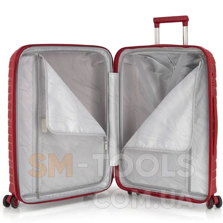 - Чемодан разделен перегородкой на молнии на два основных отделения, перегородка имеет сетчатый карман на молнии.