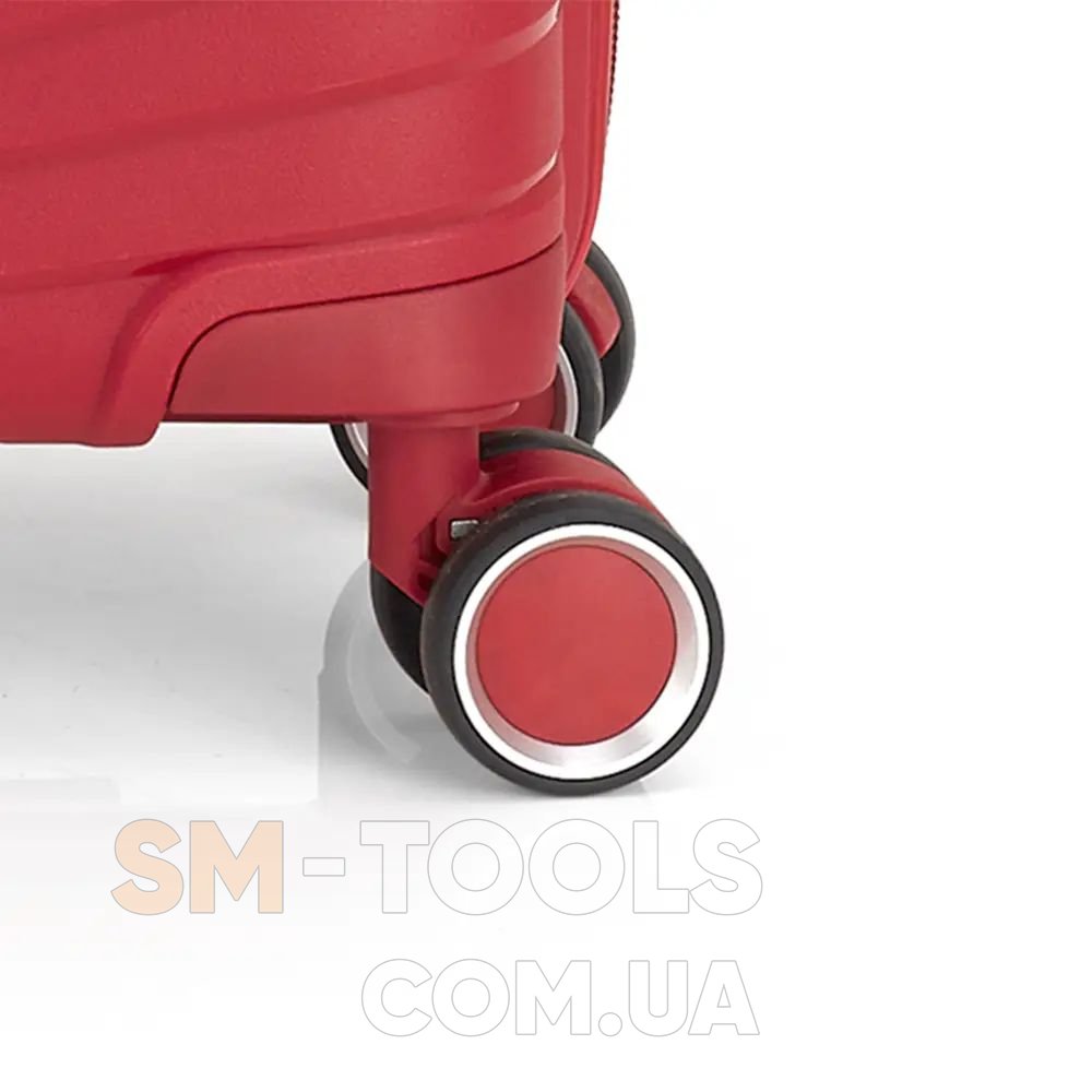 Чемодан оснащен четырьмя полноповоротными, спаренными колесами с возможностью независимого разворота каждого колеса на 360 °. Системой предусмотрено равномерное перераспределения нагрузки на каждое колесо, что в свою очередь способствует плавному качению и маневренности чемодана, прилагая при этом минимум усилий. Колеса изготовлены из высокотемпературного термопластичного полиуретана (TPU). Материал обладает прочностью сравнимой с пластиком, гибкостью силикона, а так же имеет повышенную устойчивость к перепадам температур. Отличительной особенностью колес из TPU материала является снижение шума до минимума при качении чемодана по неровной поверхности. Благодаря устойчивости к истиранию материал колес отличается длительным сроком эксплуатации.