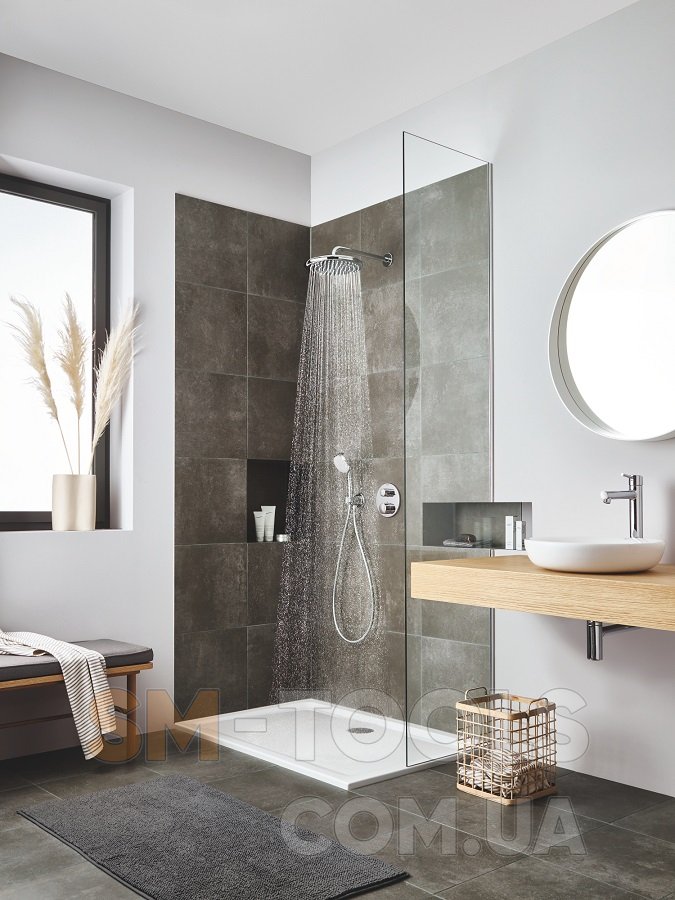 Термостатичний змішувач для душу GROHE Grohtherm завдяки округлій формі і тонкому профілю ідеально підійде для проектів, виконаних в мінімалістичному дизайні.
