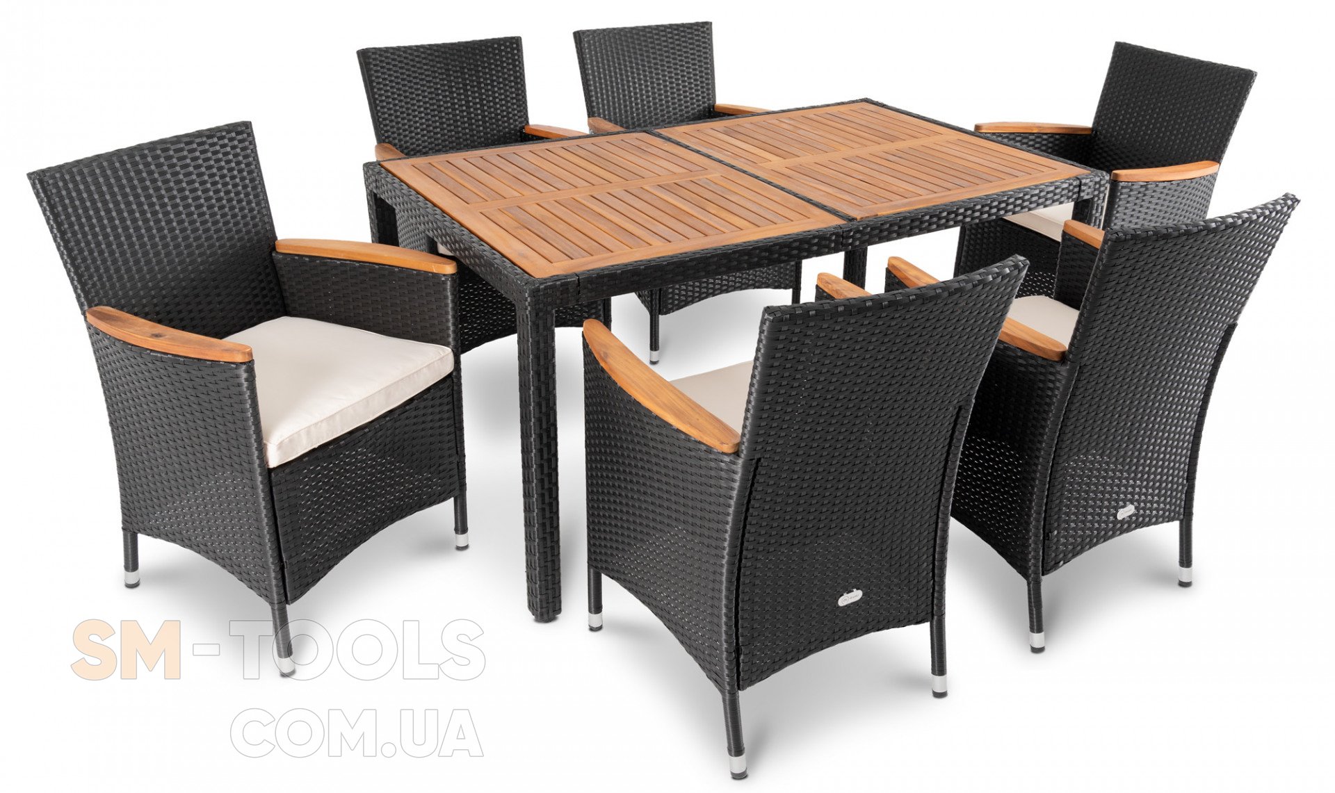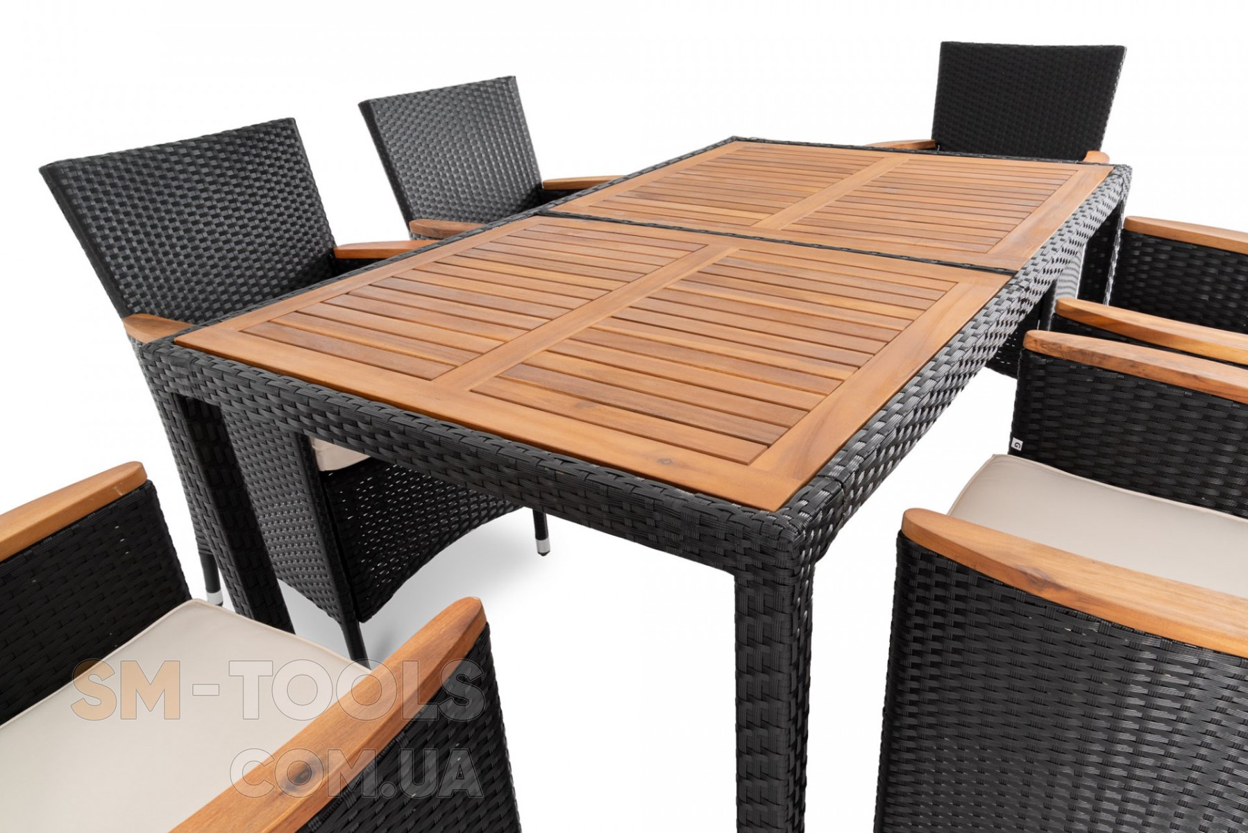 Відпочиньте в саду з сім'єю і друзями! Розміри стола: довжина 150 см/ ширина 90 см/ висота 74 см, вистачить місця для шести осіб. Стільниця виконана з дерева акації. При правильному догляді стіл стійкий до води, легко чиститься і, перш за все, надзвичайно міцний. Він прослужить довгі роки.