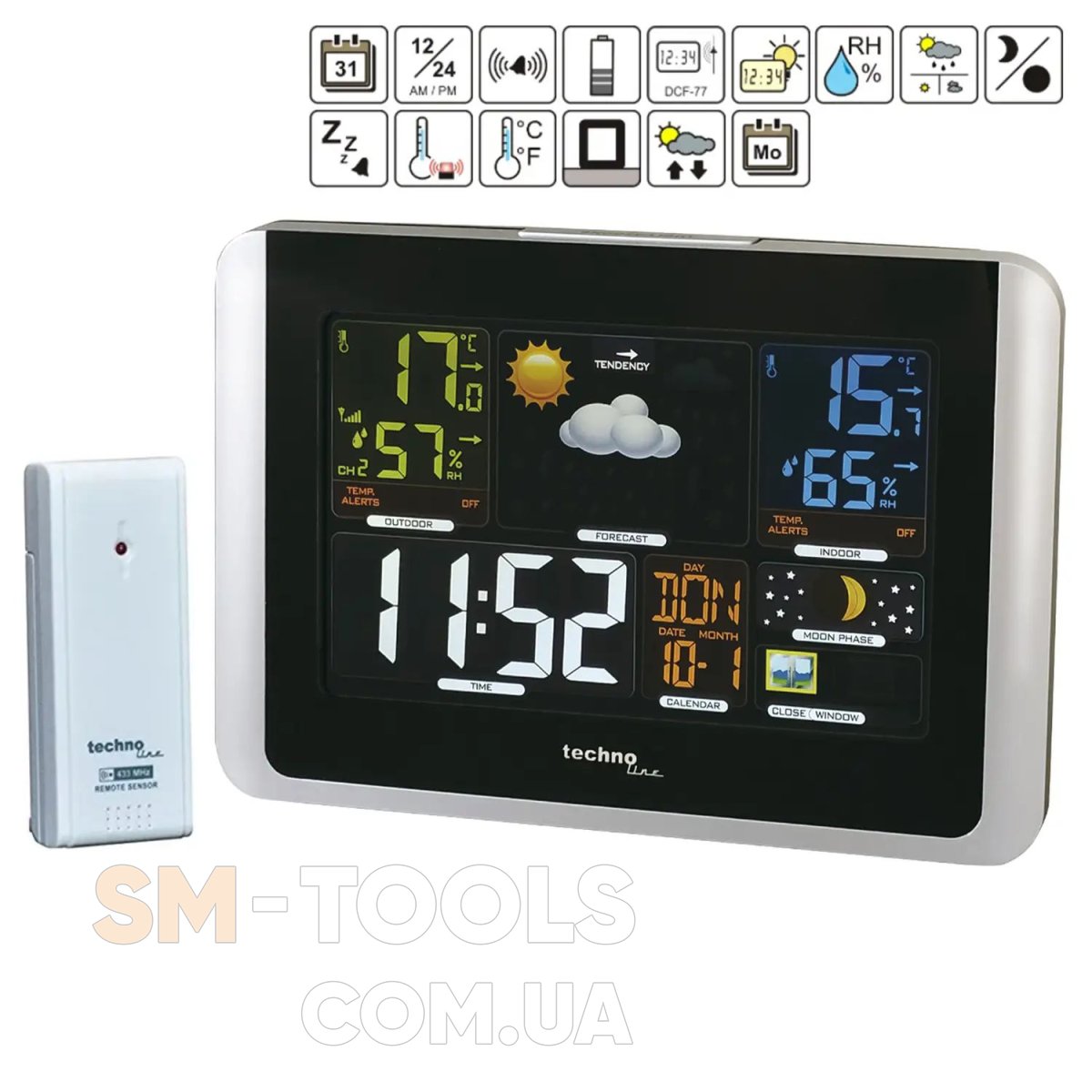 - Символьний прогноз погоди. На дисплеї відображаються погодні іконки (ясно, змінна хмарність, хмарно, дощ, злива, сніг):