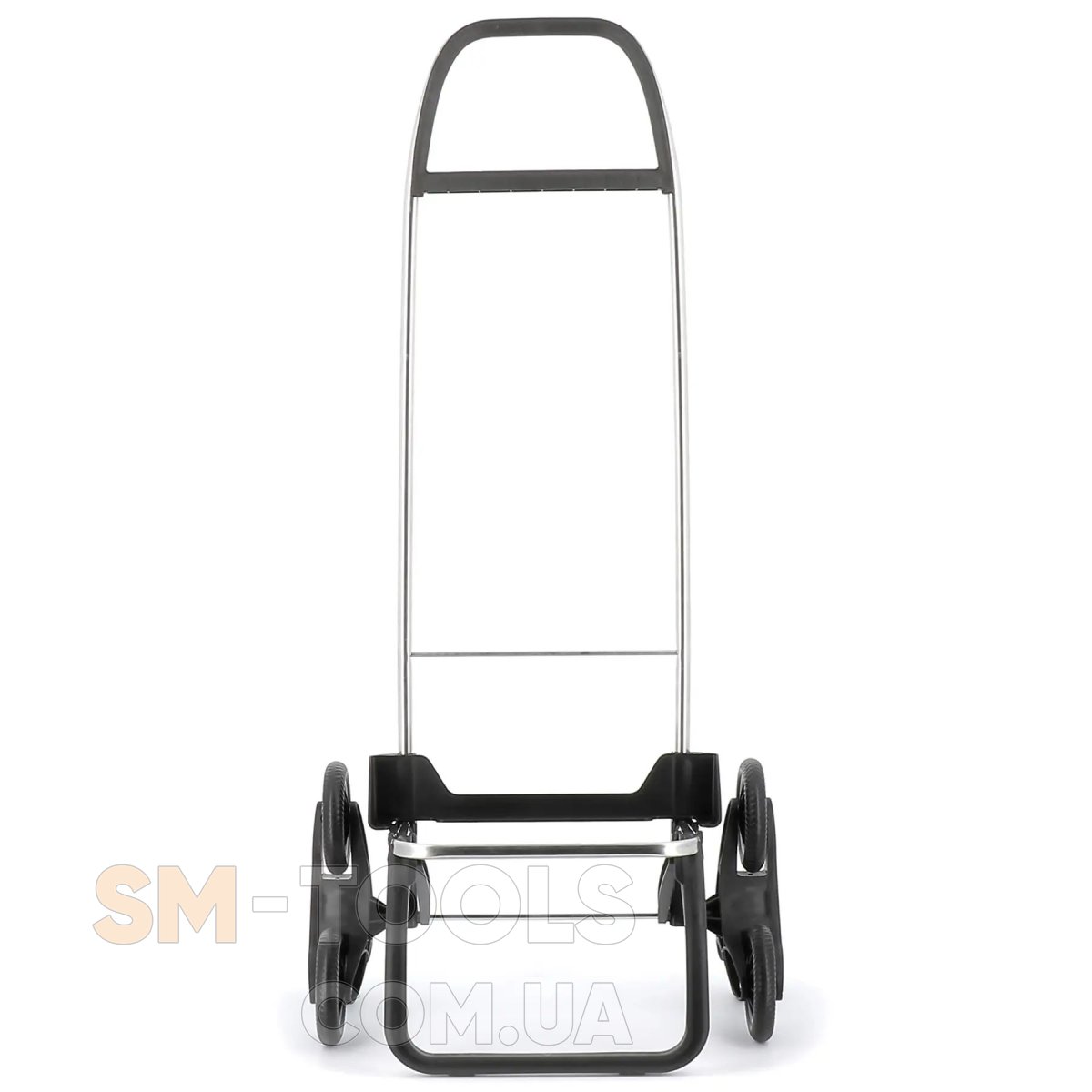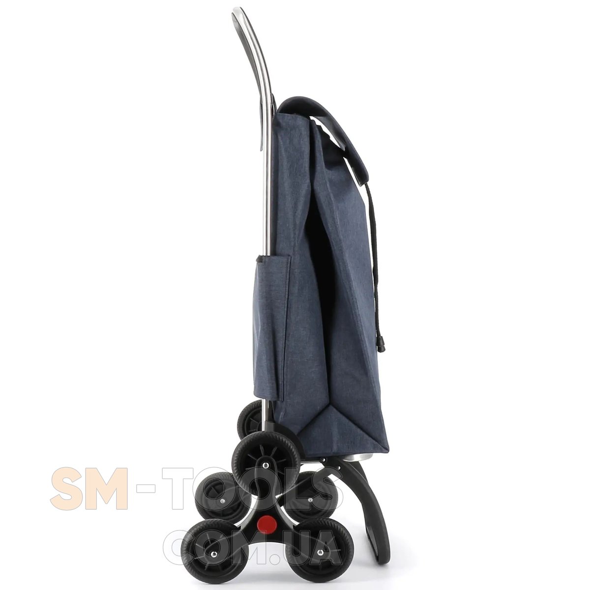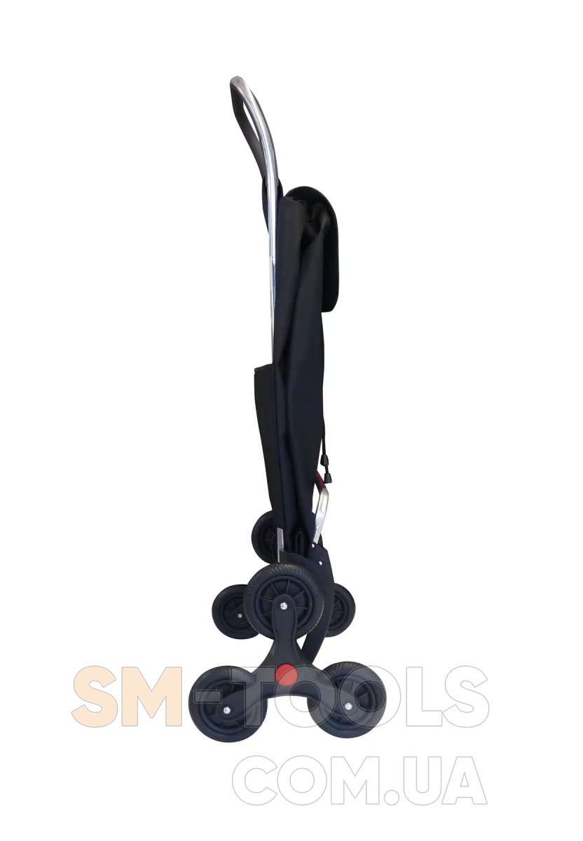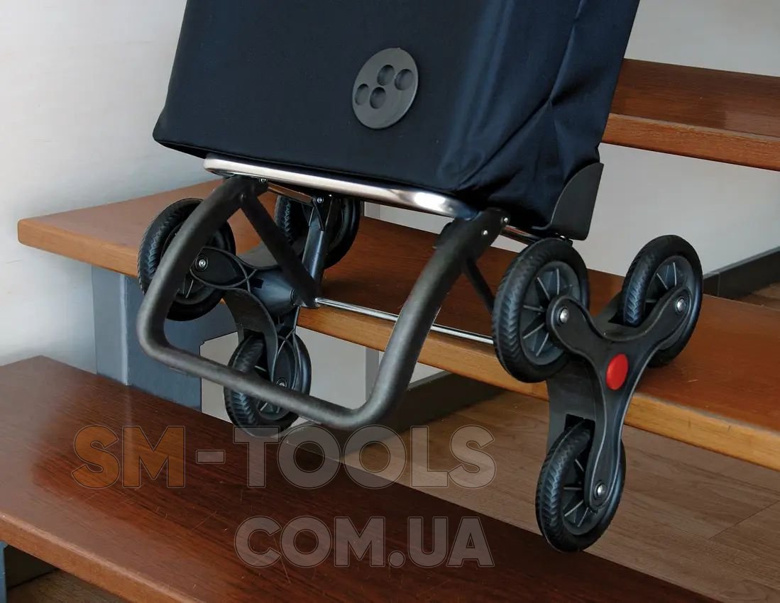 6-колісний алюмінієвий візок, що ідеально підходить для підйому сходами без зусиль. При русі рівною поверхні в ходу беруть участь чотири колеса, при цьому вага всього навантаження рівномірно розподіляється по шасі і не навантажує вашу спину. Шасі оснащено передньою опорою, що дозволяє стійко вільно паркувати сумку у просторі. При цьому його можна скласти одним рухом. Натискаючи на червоні точки, ви просто знімаєте колеса з шасі і отримуєте ідеально пласку форму для зручного зберігання. Внутрішня частина рукоятки має пластикове оздоблення для комфортного транспортування сумки-візка в холодну пору року. Міцний поліестеровий водозахищений матеріал сумки покликаний захистити вміст від зовнішніх несприятливих умов (дощ, сніг). Сумка знімна, має зручну широку горловину для зручності завантаження/вивантаження продуктів, яка стягується стяжним шнуром із фіксатором. Верх сумки накритий захисним клапаном. На дні сумки передбачено жорстке вставне пластикове дно, яке під час пересування спирається на розкладену знизу візка пластикову основу. Візок дуже мобільний і стійкий.