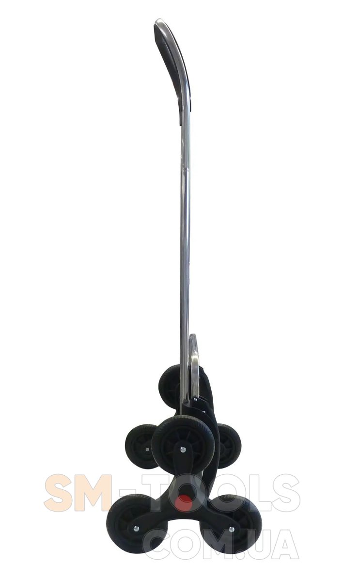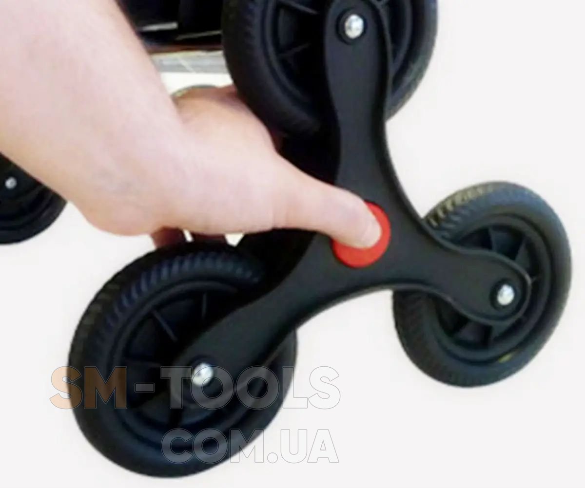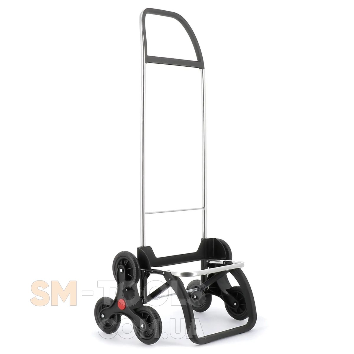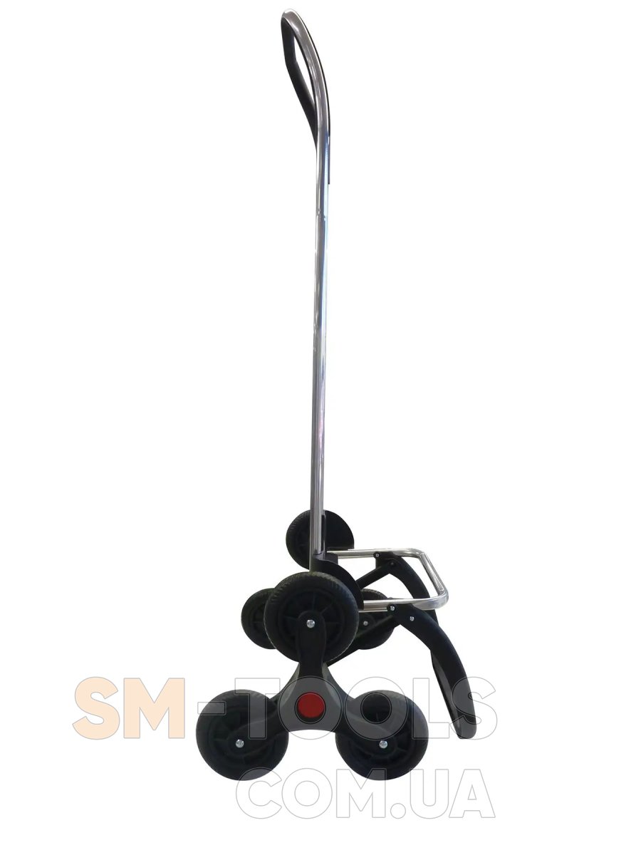 6-колісний алюмінієвий візок, що ідеально підходить для підйому сходами без зусиль. При русі рівною поверхні в ходу беруть участь чотири колеса, при цьому вага всього навантаження рівномірно розподіляється по шасі і не навантажує вашу спину. Шасі оснащено передньою опорою, що дозволяє стійко вільно паркувати сумку у просторі. При цьому його можна скласти одним рухом. Натискаючи на червоні точки, ви просто знімаєте колеса з шасі і отримуєте ідеально пласку форму для зручного зберігання. Внутрішня частина рукоятки має пластикове оздоблення для комфортного транспортування сумки-візка в холодну пору року. Міцний поліестеровий водозахищений матеріал сумки покликаний захистити вміст від зовнішніх несприятливих умов (дощ, сніг). Сумка знімна, має зручну широку горловину для зручності завантаження/вивантаження продуктів, яка стягується стяжним шнуром із фіксатором. Верх сумки накритий захисним клапаном. На дні сумки передбачено жорстке вставне пластикове дно, яке під час пересування спирається на розкладену знизу візка пластикову основу. Візок дуже мобільний і стійкий.