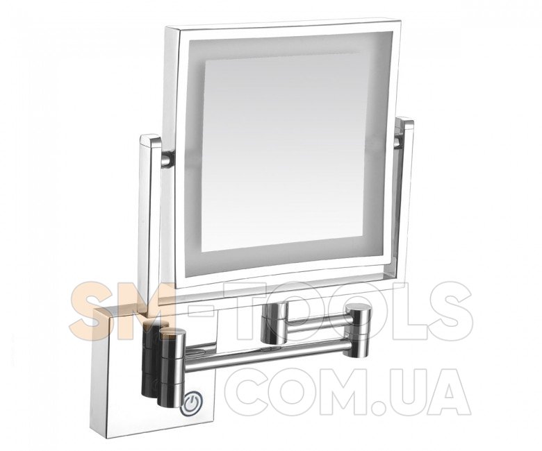 Дзеркало підвісне, квадратне, двостороннє, хромоване покриття, високоякісна латунь, збільшення 1Х та 3Х, чутлива сенсорна кнопка увімкнення, підсвічування, зовнішнє підключення, гарантія 3 роки.