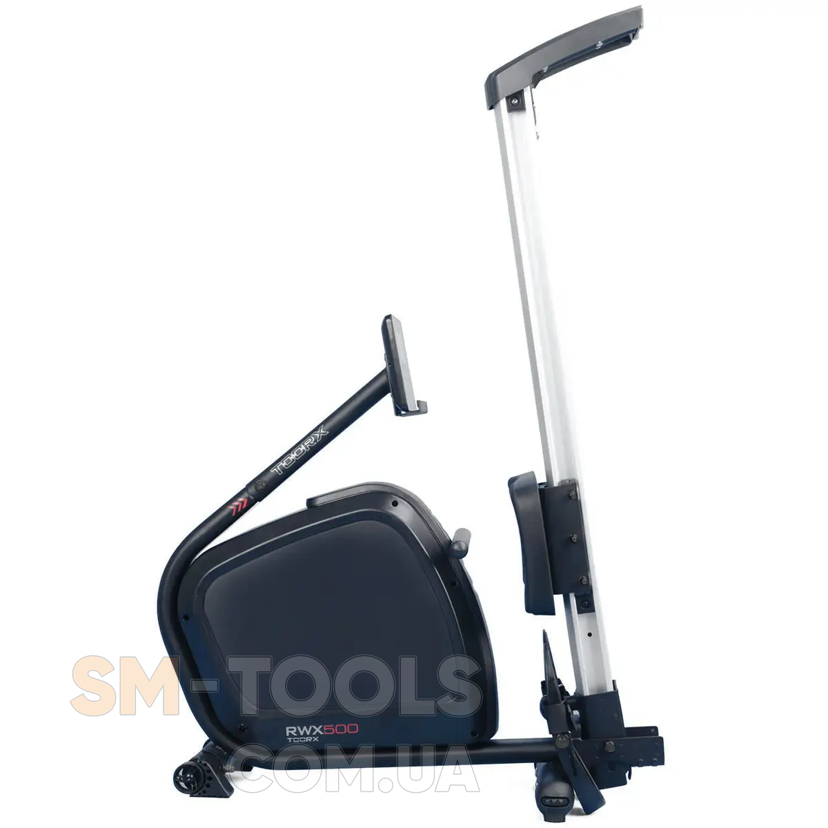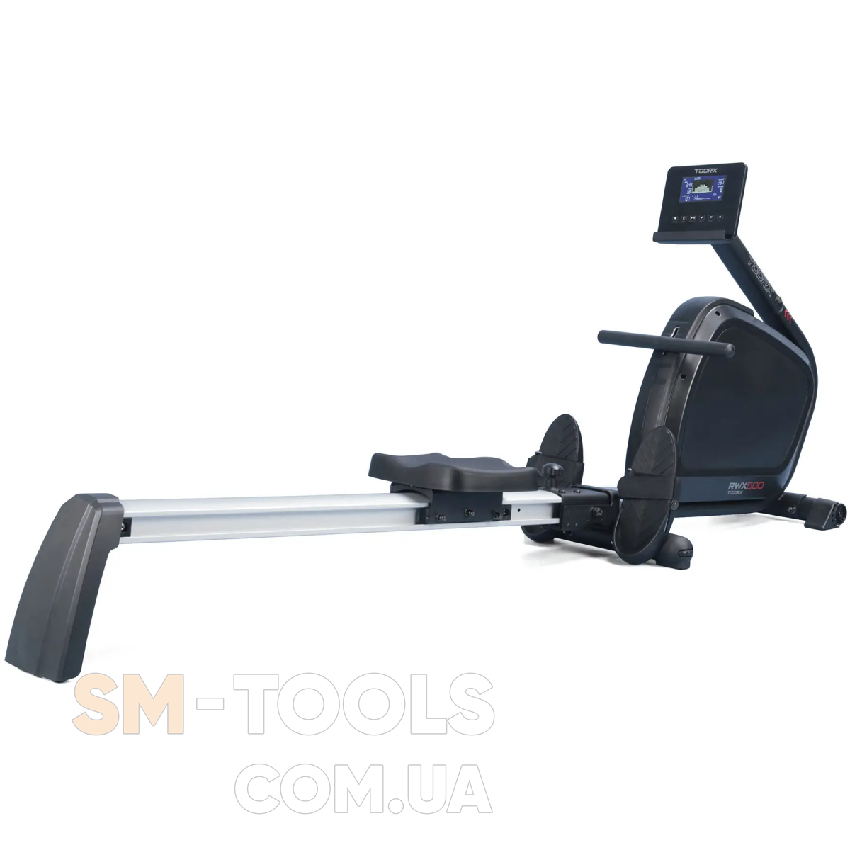 Гребний тренажер Toorx Rower RWX 500 (RWX-500) із преміальної лінійки Chrono Line італійського виробника Garlando SpA призначений для комплексного кардіотренування в домашніх умовах. Тренажер має 16 рівнів навантаження, що регулюється за допомогою сучасного комп'ютера. 9-кілограмовий маховик завдяки магнітній системі гальмування, яка не виробляє тертя, забезпечує оптимальну амплітуду рухів та відносну безшумність у процесі тренування. Гребний тренажер розрахований на вагу до 130 кг, а його сидіння на роликах ковзає по алюмінієвій напрямній, гарантуючи необхідний комфорт навіть за тривалих вправ. Вбудований приймач для бездротового датчика вимірювання пульсу буде доречним під час тренування для контролю частоти серцевих скорочень.