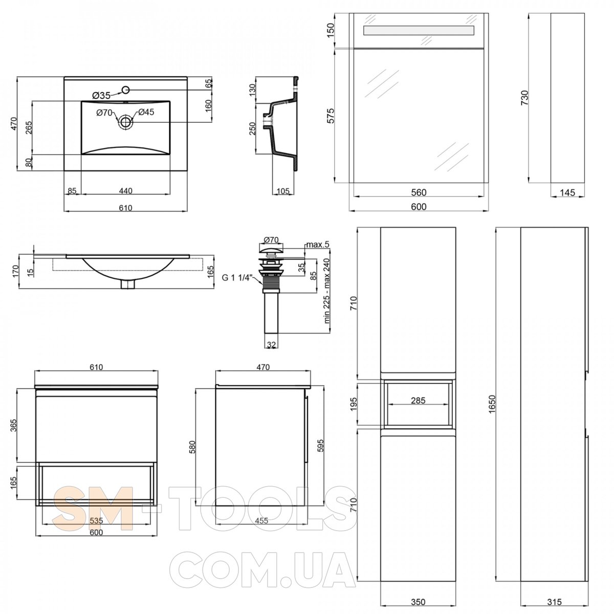 Характеристики Комплект меблів для ванної кімнати Qtap Robin тумба з раковиною + дзеркальна шафа + пенал QT044RO42969:
