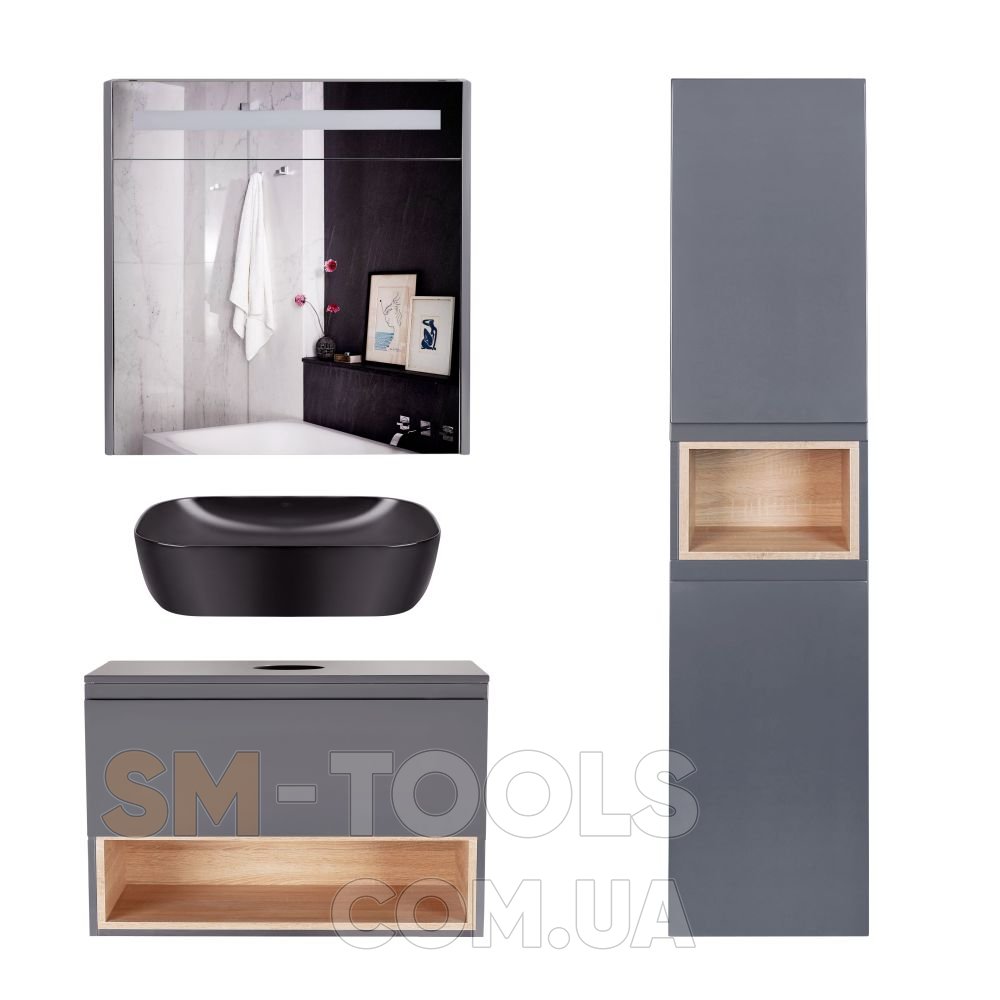 - Комплектация: тумба с раковиной, пенал, зеркальный шкаф