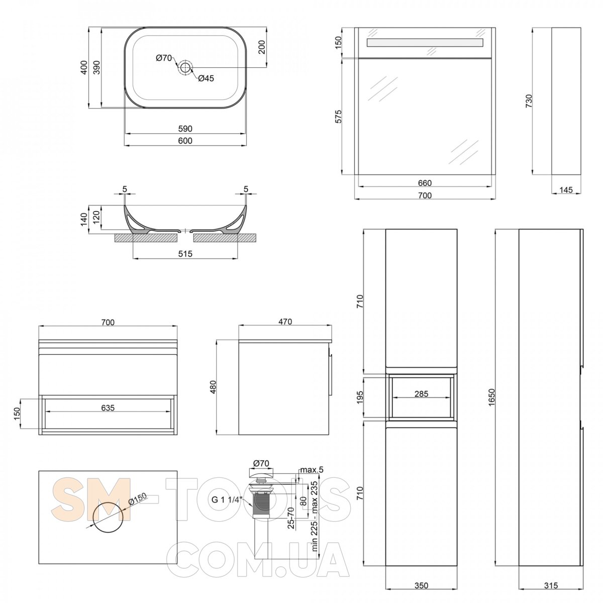 Характеристики Комплект меблів для ванної кімнати Qtap Robin тумба + раковина + дзеркальна шафа + пенал QT044RO42985: