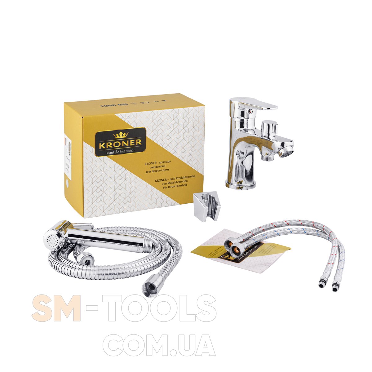 Змішувач, гнучка підводка, душовий шланг, лійка для гігієнічного душу, кронштейн, кріплення, інструкція.