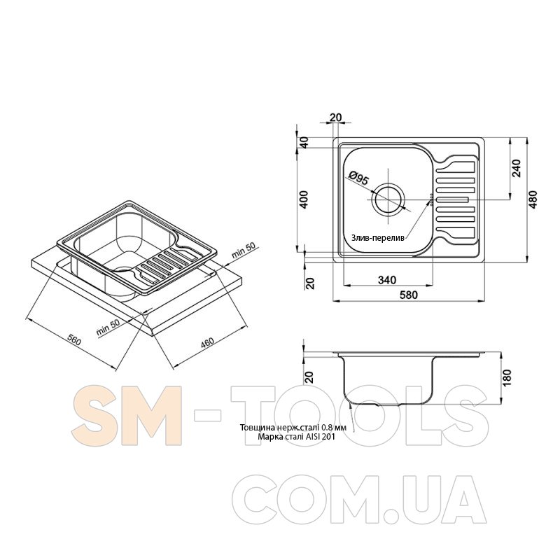 Мийка, сифон, злив-перелив, кошиковий вентиль, стрічка ущільнююча, кріплення.