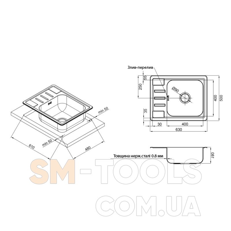 Характеристики Кухонна мийка Kroner KRP Satin-6350 (0,8 мм) CV022779: