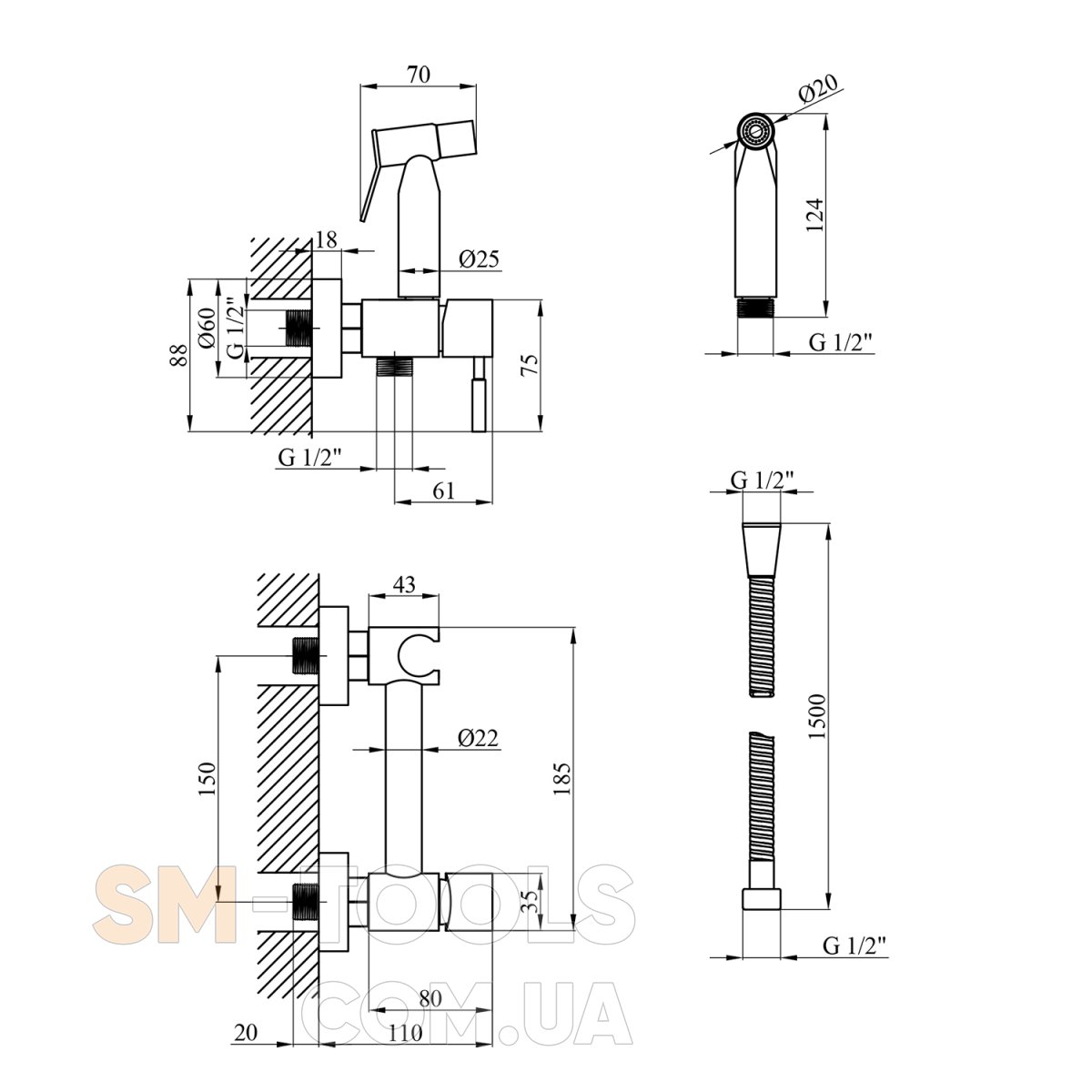 Довжина душового шлангу, мм 1500