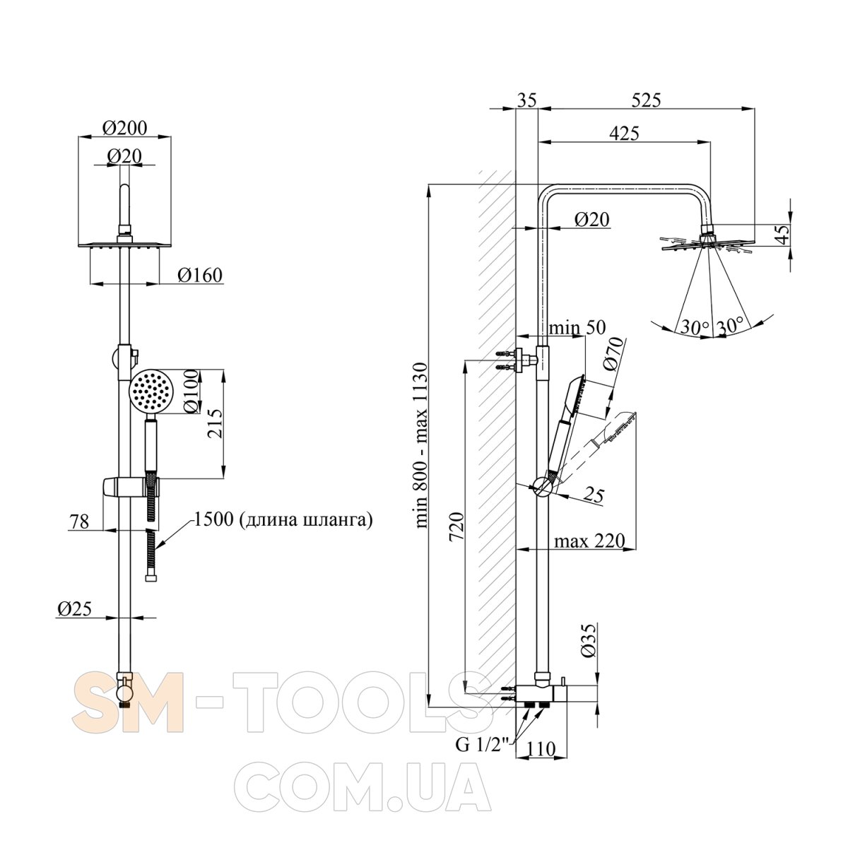 Душова стійка, кронштейн для ручного душу, душовий шланг, ручна лійка, верхній душ, кріплення.