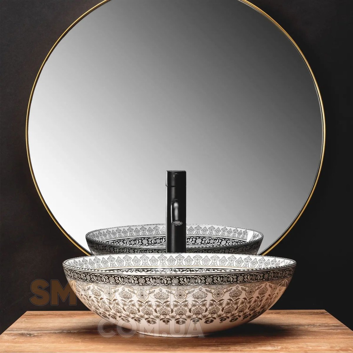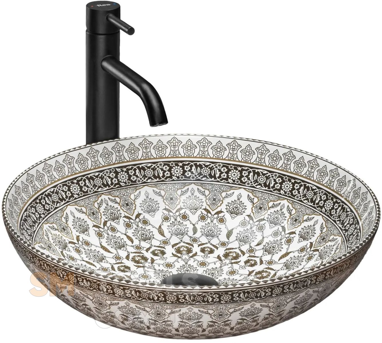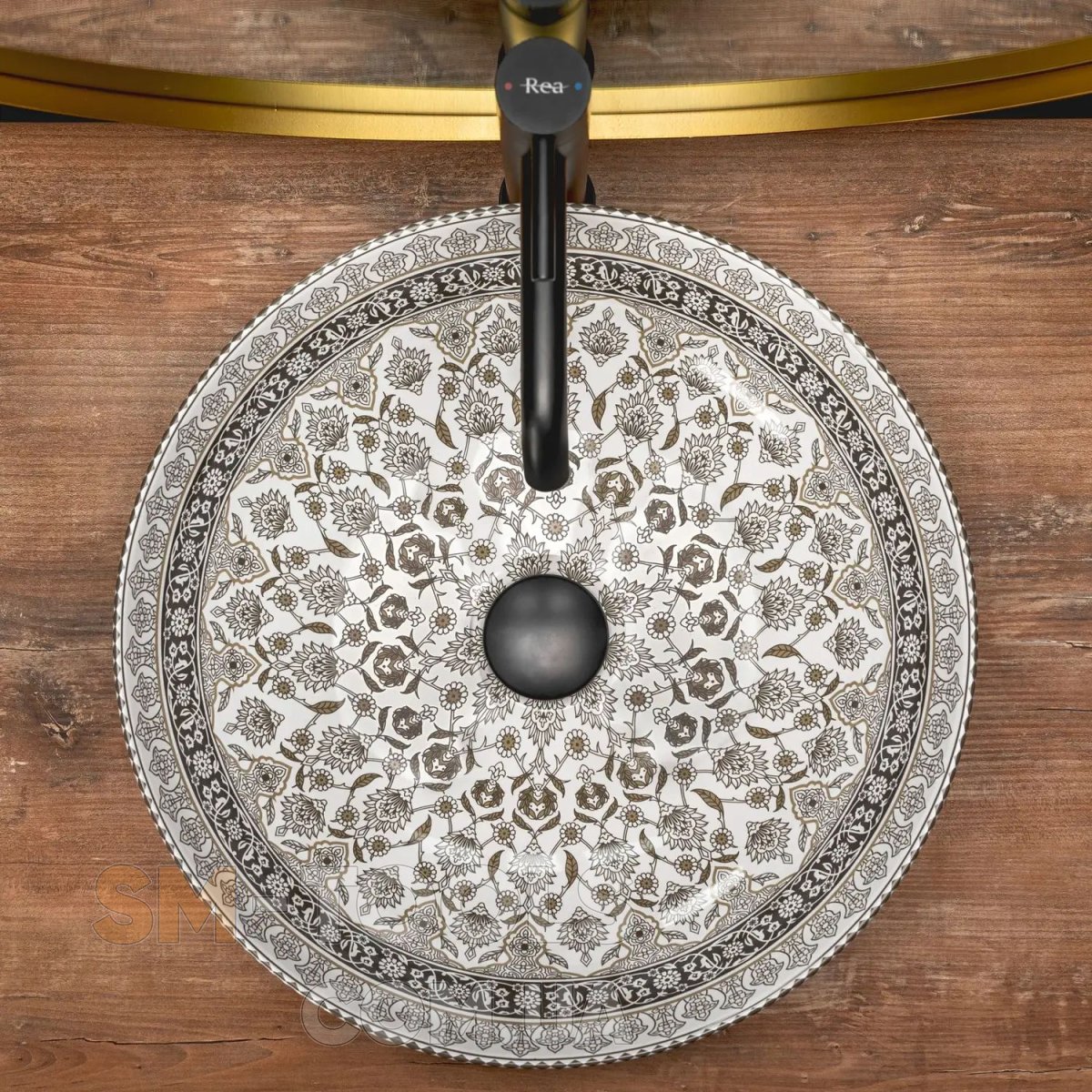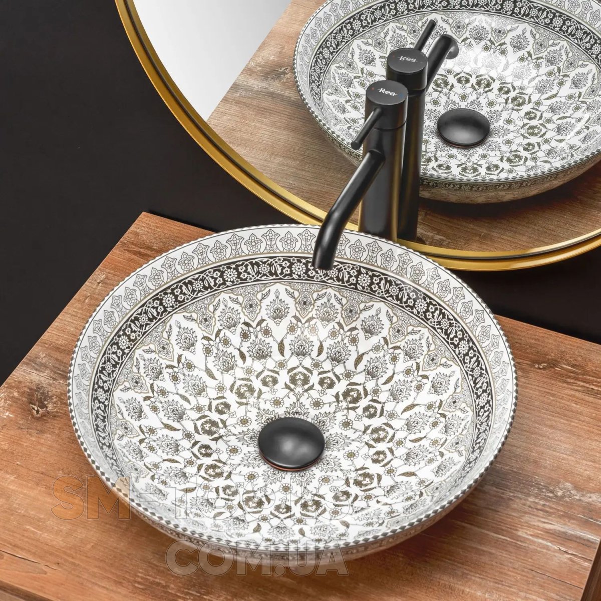 Умивальник круглої форми з білої кераміки екстра-класу. Глянсова обробка із золотистим візерунком додасть екзотика і прикрасить інтер'єр. Це буде працювати і як практичне рішення, так як раковину дуже легко утримувати в чистоті. Вона стане відмінним доповненням для любителів овальних форм, привносячи елегантність в облаштування ванної кімнати будинку і в офісі. Завдяки особливому етапу виробництва він міцний і легко миється.