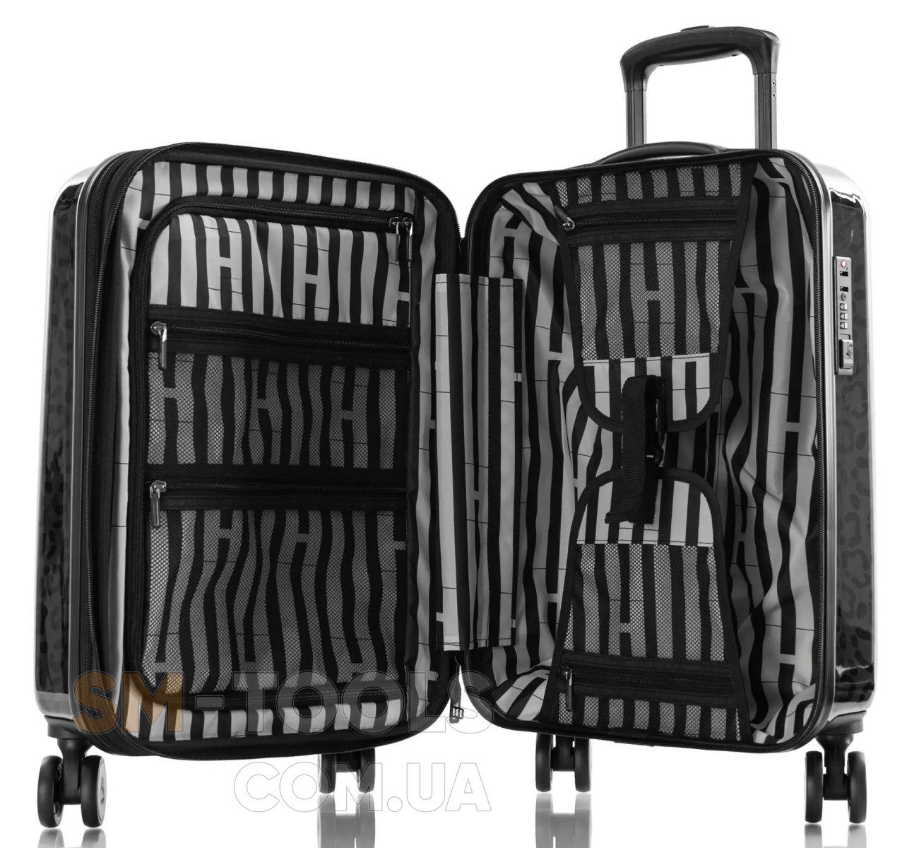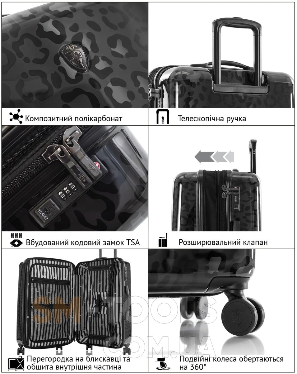 Валізи Heys Black Leopard виконані з дуже легкого, еластичного і в той же час міцного матеріалу. Завдяки своїм властивостям, полікарбонат композитний (Polycarbonate Composite) стійкий до деформацій (після деформації приймає колишню форму), не розтріскується на морозі, також використовується при виготовленні куленепробивного скла.