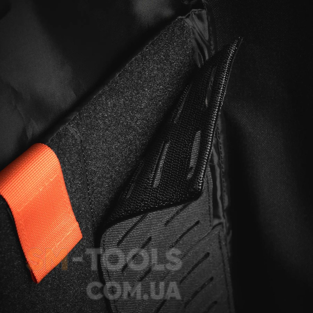 - Передня кишеня на блискавці з повним розкладним отвором.