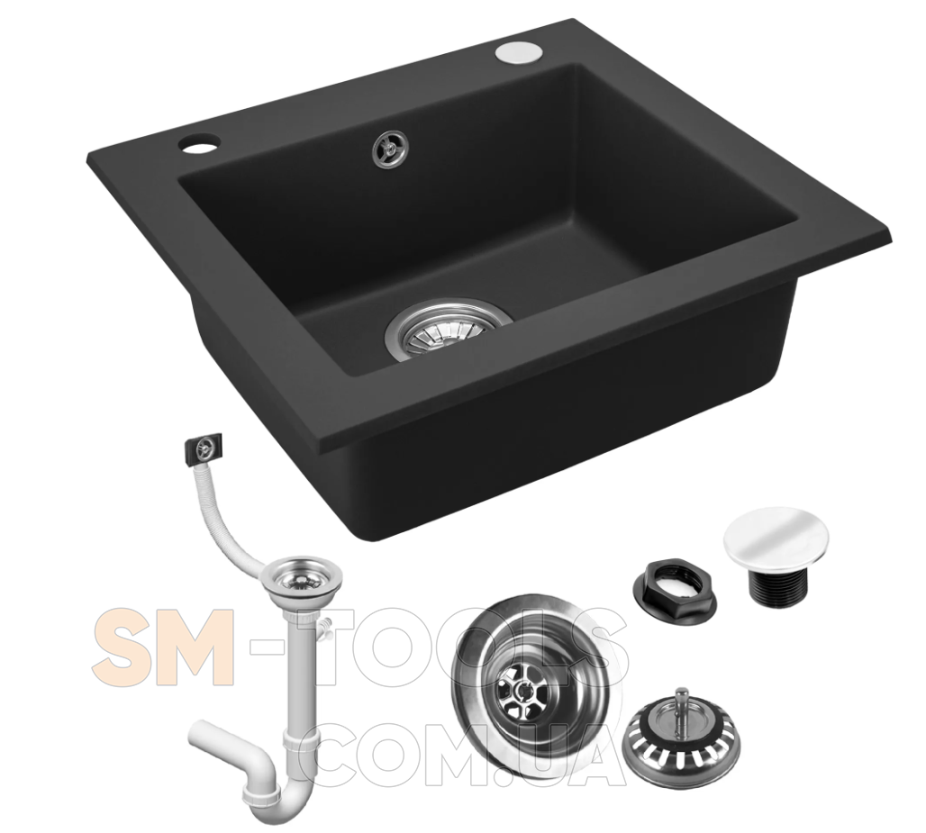 В комплекте с мойкой : сифон с решеткой, шланг соединения с переливом