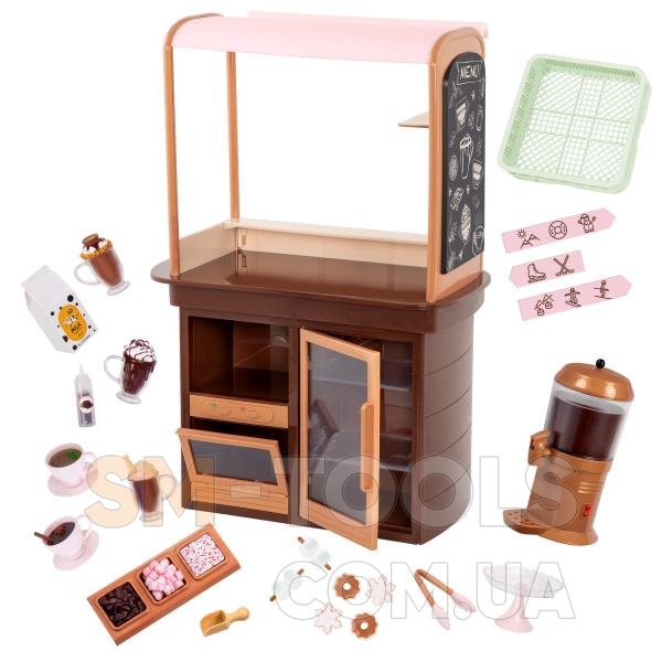 Насолоджуйтесь солодкими частуваннями зі своїми найкращими друзями з прилавком для Шоколаду Our Generation! Виберіть смачний десерт з дошки меню та приготуйтеся обслуговувати своїх клієнтів з посмішкою. Приготуйте 5 різних чашок гарячого шоколаду за допомогою машини гарячого шоколаду, а потім прикрасьте кожну чашку зефіром, шоколадом і присипками з піддону для начинки Хочете печива? Покладіть смачне печиво на вітрину і поставте його на прилавок. Потім за допомогою щипців роздайте їх своїм друзям. Комплектація: Прилавок для шоколаду, машина для гарячого шоколаду, лоток для топінгу з 3-ма смаками, черпак, 2 палички зефіру, 2 склянки гарячого шоколаду зі блюдцями, 3 кружки гарячого шоколаду , 4 печива, коробка з молоком, 3 ігри, лоток з підставкою, пара щипців, пляшка шоколаду, піддон для посудомийної машини.