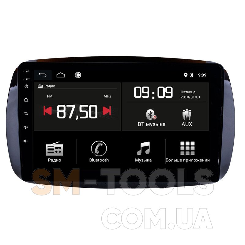 Сумісні марки автомобілів : SmartРозмір екрану : 9"Роздільна здатність екрану : 1280*720GPS : ЕстьBluetooth : ЕстьТюнер : FM/AMПідтримка карт пам'яті : USBМаксимальна вихідна потужність : 4*55ВтПідтримка управління кнопками на кермі : ЕстьВстановлене ПЗ : AndroidНавігаційне ПЗ : Google НавигаторТеги : на AndroidФормати відтворення : MPEG-4 MKVХарактеристики