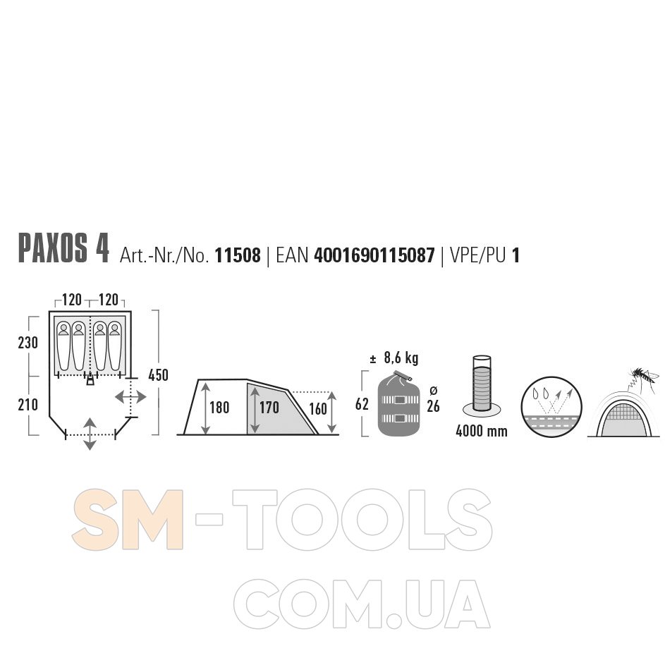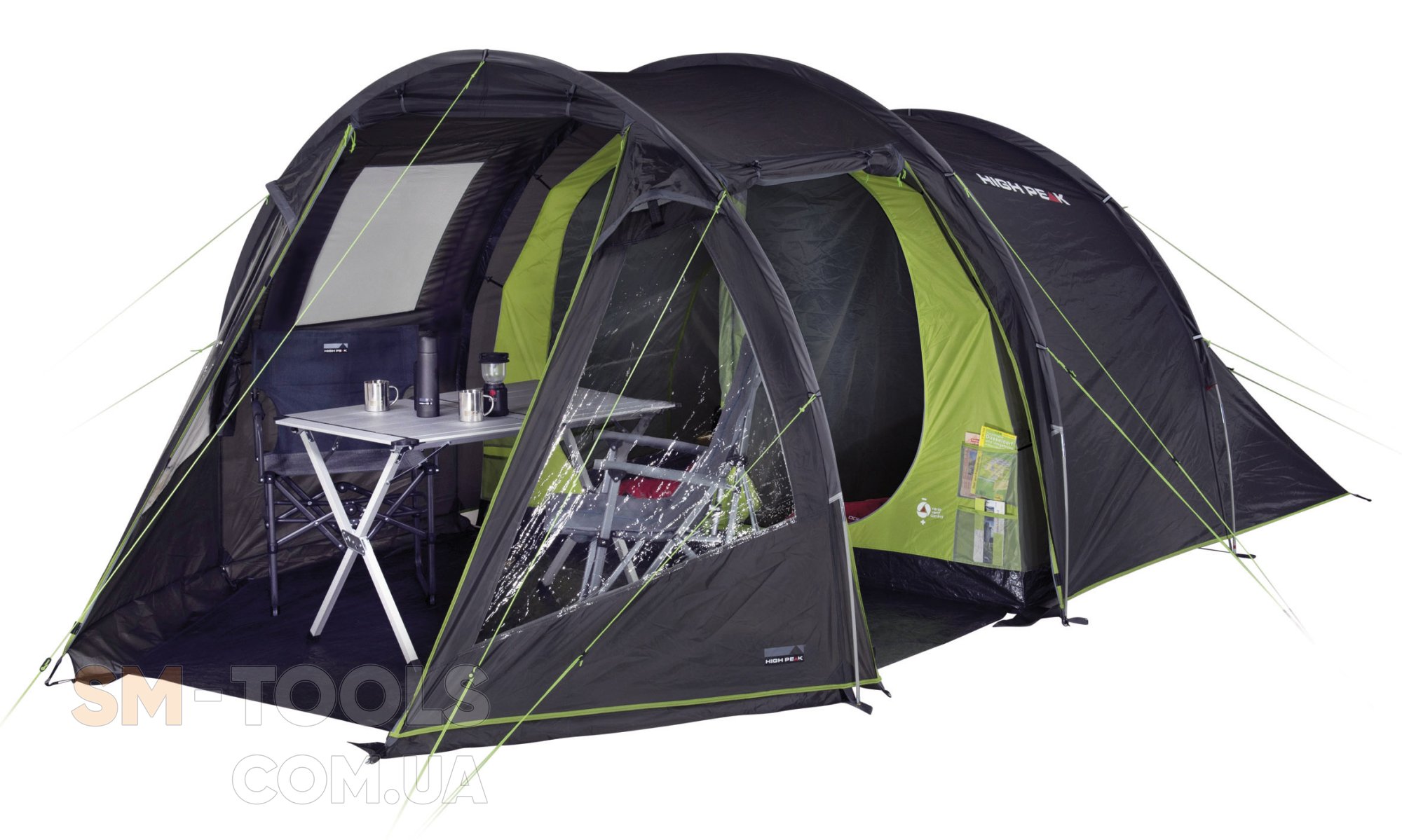 High Peak Paxos 4 Dark Grey/Green (11508) - чотиримісний тунельний намет для сімейного відпочинку та туристів, які цінують комфорт. Простора житлова зона зі знімною підлогою дозволяє розмістити всі Ваші речі та сховатись всередині в дощову погоду. Наявність двох входів робить зручним доступ до намету. Фронтальні прозорі вікна у житловій зоні наповнюють внутрішнє приміщення світлом, а штори за необхідності забезпечують усамітнення. Бокове сітчасте вікно із занавіскою збільшує додаткову вентиляцію. Широка затемнена спальня зі знімною перегородкою гарантує комфортний сон не тільки вночі, але і при яскравому сонці. Система вентиляції Vario Vent Control забезпечує регульований приплив свіжого повітря у внутрішній намет. Якщо похолодало, просто налаштуйте внутрішню заслінку. Дверний клапан на блискавці легко регулюється зсередини і акуратно складається в зручну кишеню для зберігання. Два фронтальні та тильне вентиляційні вікна призначені для забезпечення циркуляції повітря та позбавлення від утворення конденсату. Міцні сталеві кілочки діаметром 5 мм призначені для твердого ґрунту. Проклеєні шви гарантують міцність на розрив та забезпечують водонепроникність намету. Органайзер та внутрішні кишені дозволяють акуратно зберігати все необхідне. Також намет має точку кріплення для ліхтаря.