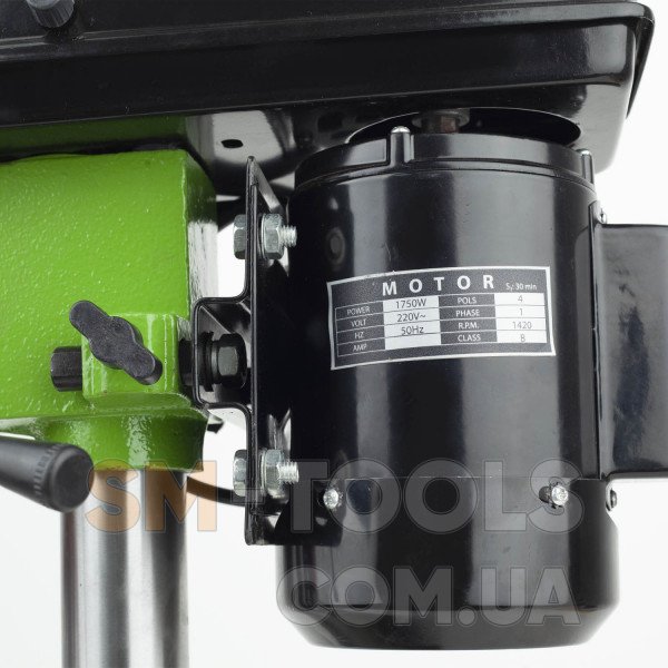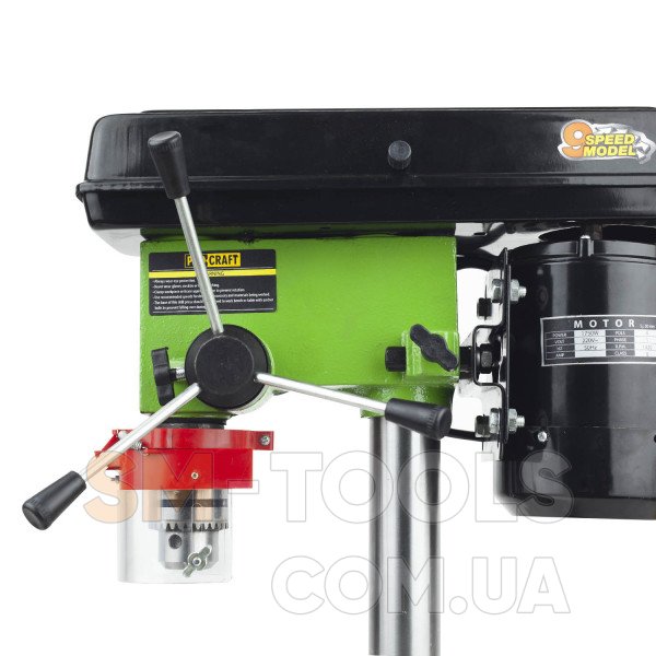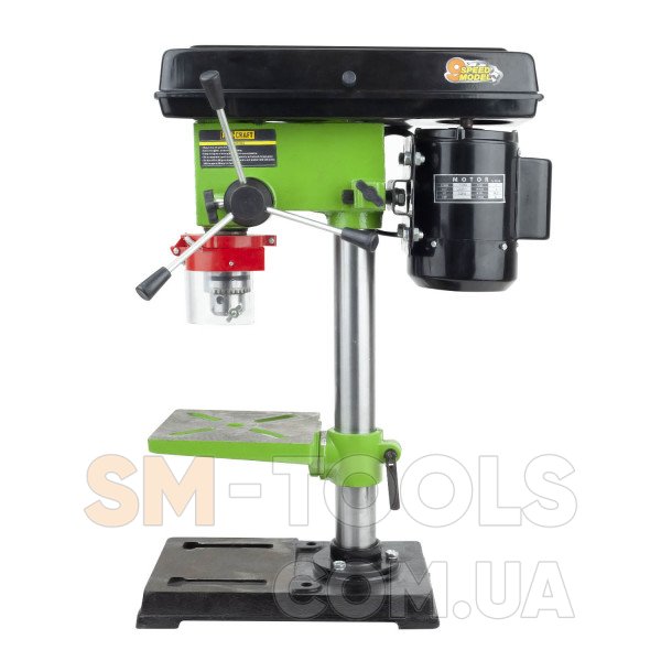 Дана модель відрізняється двигуном більшої потужності і коробки на 9 швидкостей. Для регулювання швидкості потрібно поставити ремінь приводу на потрібний шків в коробці передач. Це дозволяє змінити крутний момент, швидкість обертання, що впливає на якість свердління.