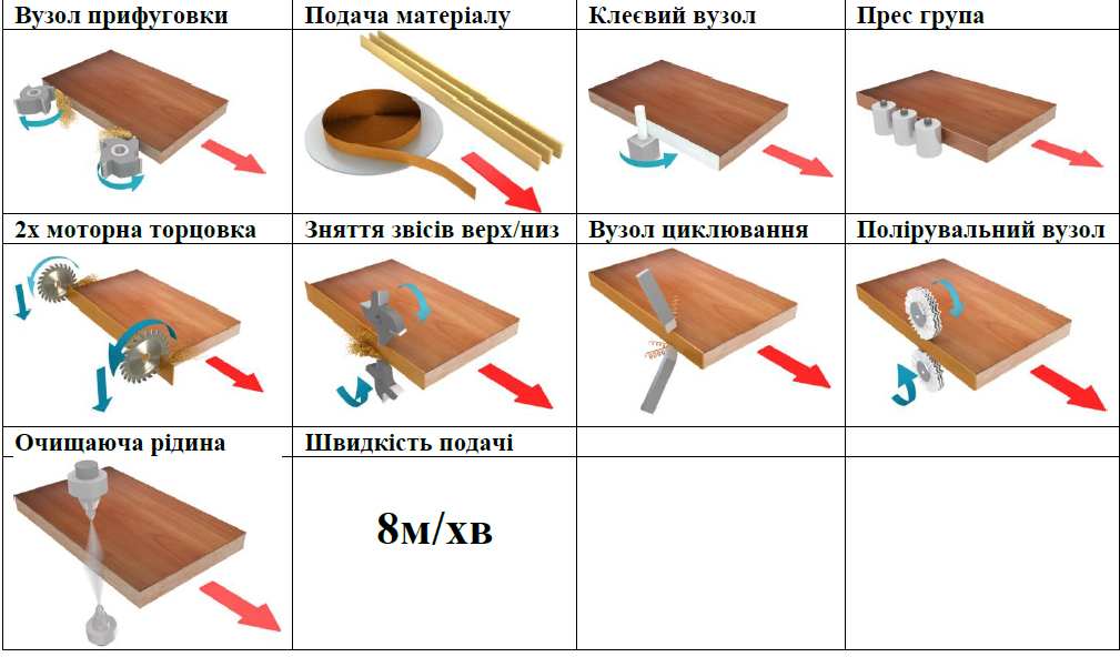 - Нанесення матеріалу кромки в режимах поздовжньої та поперечної обробки.